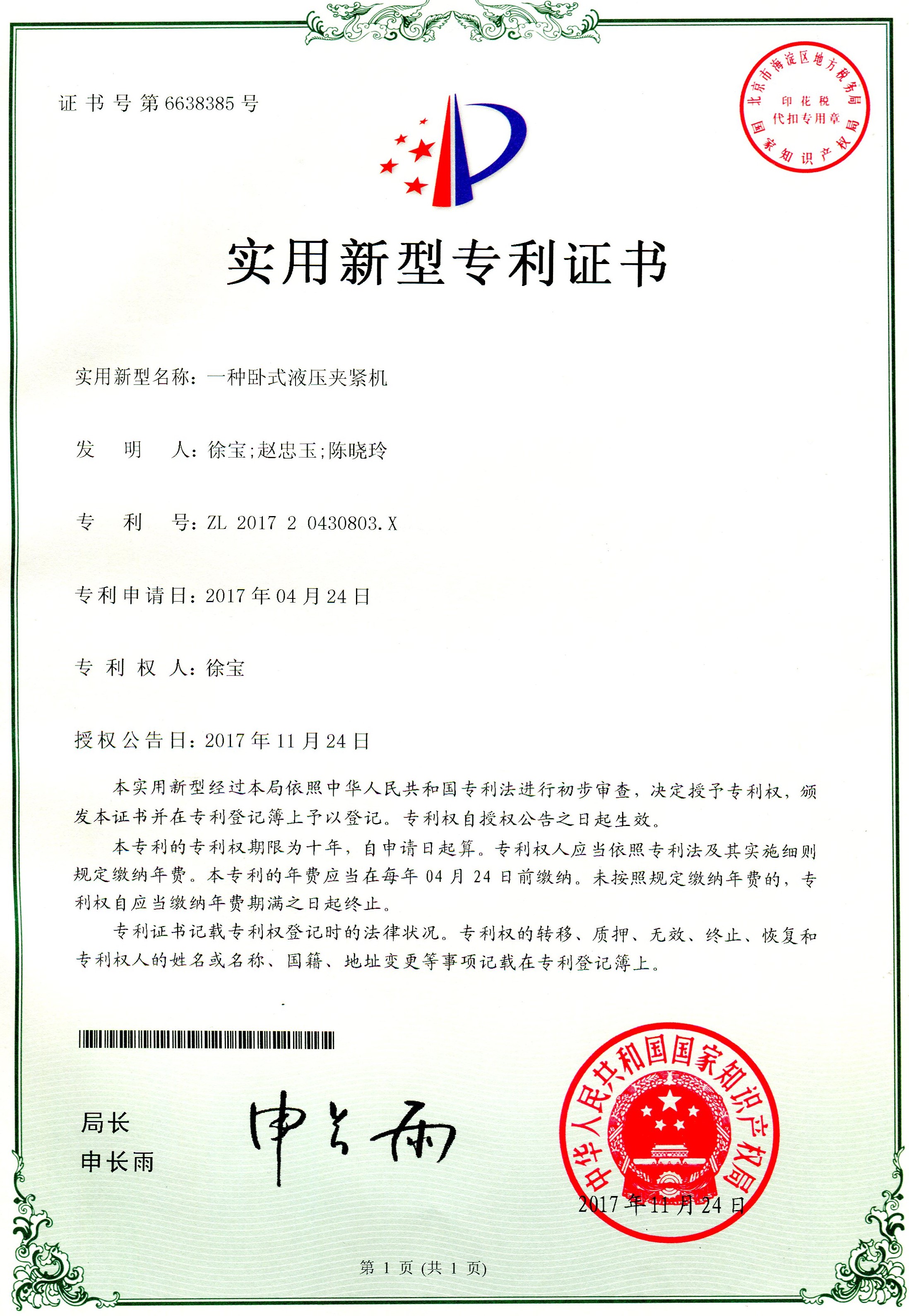 科研成果---實(shí)用新型專(zhuān)利:一種臥式液壓夾緊機(jī)