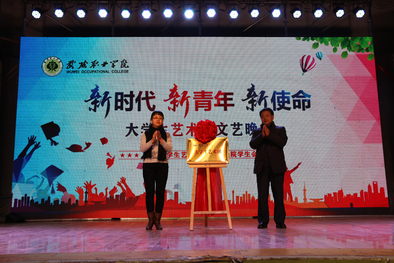 晚會(huì)開(kāi)始前舉行了學(xué)院大學(xué)生藝術(shù)團(tuán)成立揭牌儀式,黨委副書(shū)記趙明、副院長(zhǎng)田迎春上臺(tái)為大學(xué)生藝術(shù)團(tuán)揭牌。