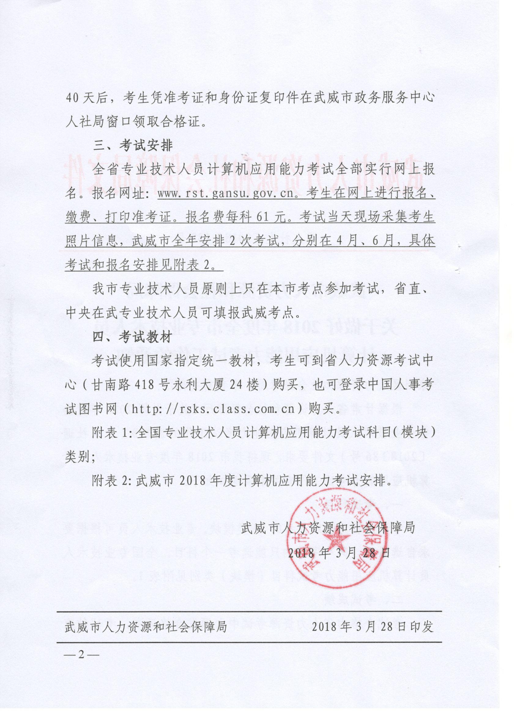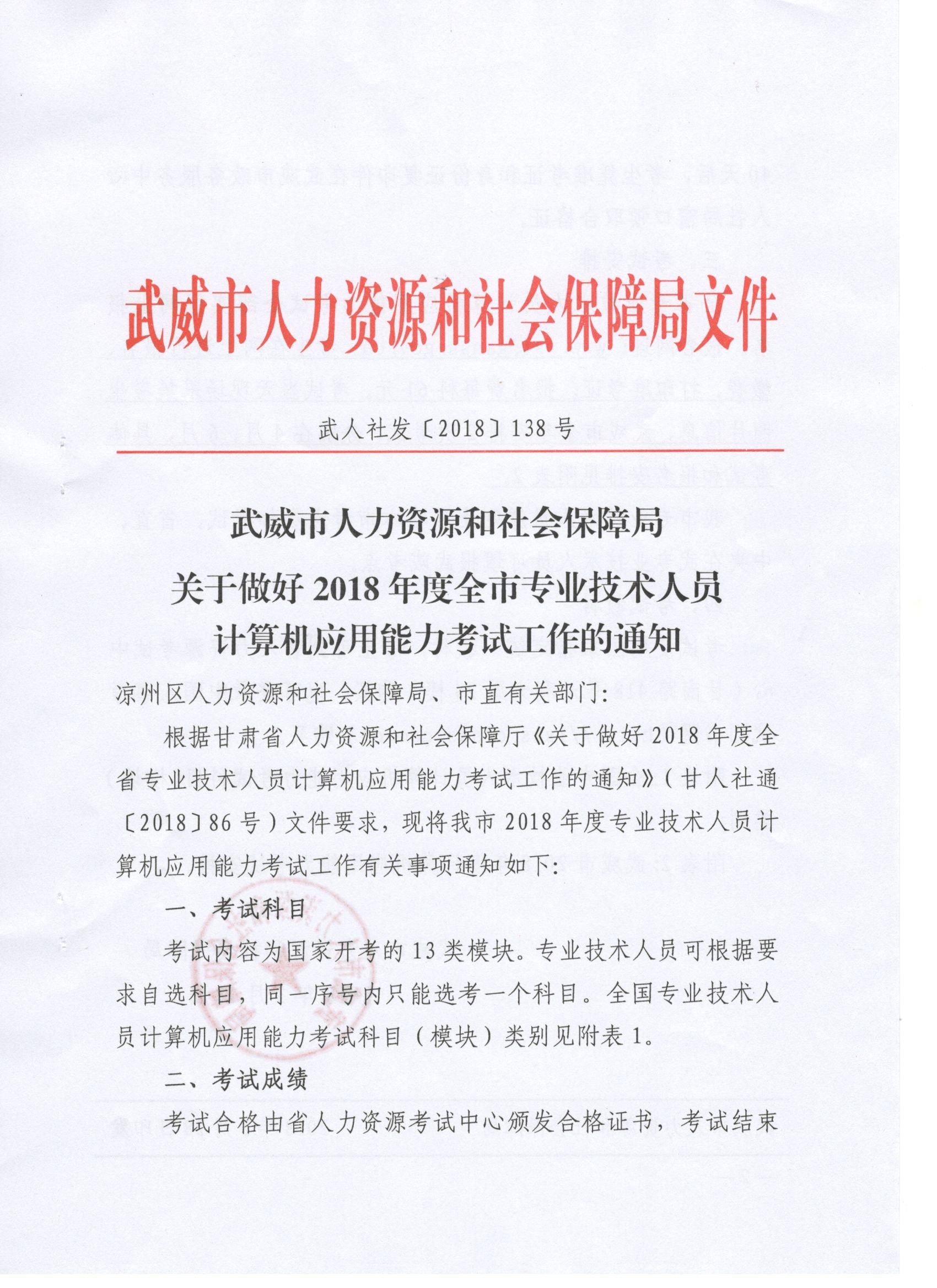 <轉(zhuǎn)>武威市人力資源和社會(huì)保障局關(guān)于做好2018年度全市專業(yè)技術(shù)人員計(jì)算機(jī)應(yīng)用能力考試工作的通知(武人社發(fā)〔2018〕138號(hào) )