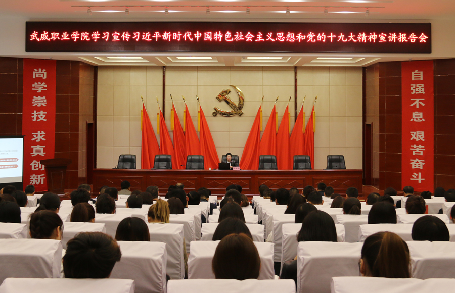 為進(jìn)一步加強(qiáng)對習(xí)近平新時代中國特色社會主義思想和黨的十九大精神的學(xué)習(xí)宣傳教育,4月9日下午,學(xué)院黨委在菁英廳舉行“武威職業(yè)學(xué)院深入學(xué)習(xí)宣傳貫徹習(xí)近平新時代中國特色社會主義思想和黨的十九大精神宣講報告會”,邀請武威市委講師團(tuán)成員、市委黨校副教授蔡生菊為學(xué)院各院系師生代表、副科級以上領(lǐng)導(dǎo)干部、直屬附屬醫(yī)院領(lǐng)導(dǎo)共計(jì)200余人作宣講報告。宣講報告會由宣傳統(tǒng)戰(zhàn)部部長王繼林主持。