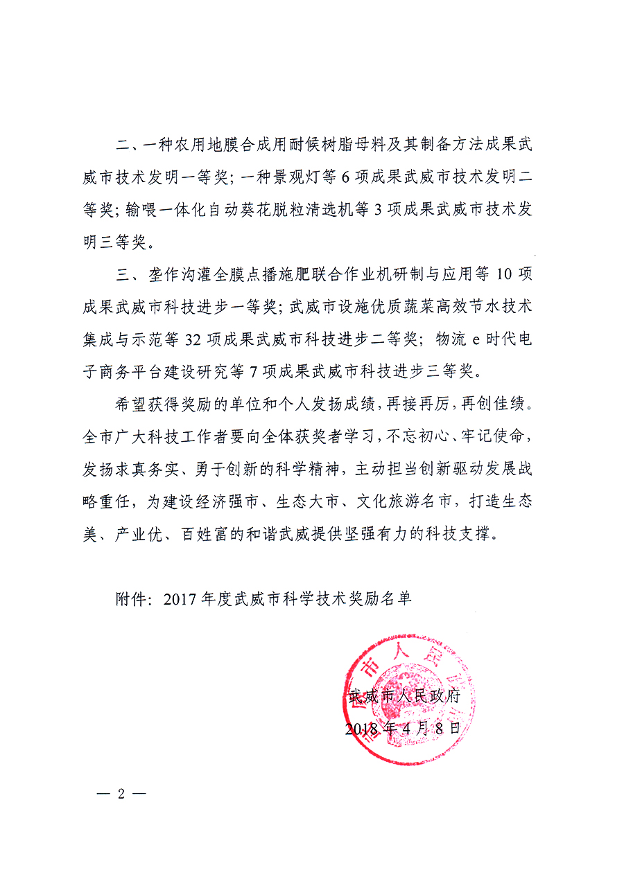 武威市人民政府關(guān)于2017年度武威市科學(xué)技術(shù)獎(jiǎng)勵(lì)的決定及獎(jiǎng)勵(lì)名單