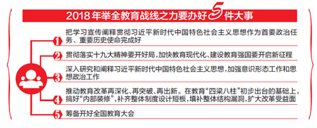 陳寶生在會議總結(jié)講話中強(qiáng)調(diào),新的一年,教育戰(zhàn)線要把握穩(wěn)中求進(jìn)的總基調(diào)、狠抓落實(shí)的總基點(diǎn)、攻堅(jiān)克難的總要求、“奮進(jìn)之筆”的總抓手,舉全教育戰(zhàn)線之力辦好幾件大事。一是把學(xué)習(xí)宣傳闡釋貫徹習(xí)近平新時(shí)代中國特色社會主義思想作為首要政治任務(wù)、重要?dú)v史使命完成好。二是貫徹落實(shí)十九大精神要開好局,加快教育現(xiàn)代化、建設(shè)教育強(qiáng)國要開啟新征程。三是深入研究和闡釋習(xí)近平新時(shí)代中國特色社會主義思想,加強(qiáng)意識形態(tài)工作和思想政治工作。四是推動教育改革再深化、再突破、再出新。在教育“四梁八柱”初步出臺的基礎(chǔ)上,搞好“內(nèi)部裝修”,補(bǔ)齊整體制度設(shè)計(jì)短板,填補(bǔ)整體結(jié)構(gòu)漏洞,擴(kuò)大改革受益面。五是籌備開好全國教育大會。