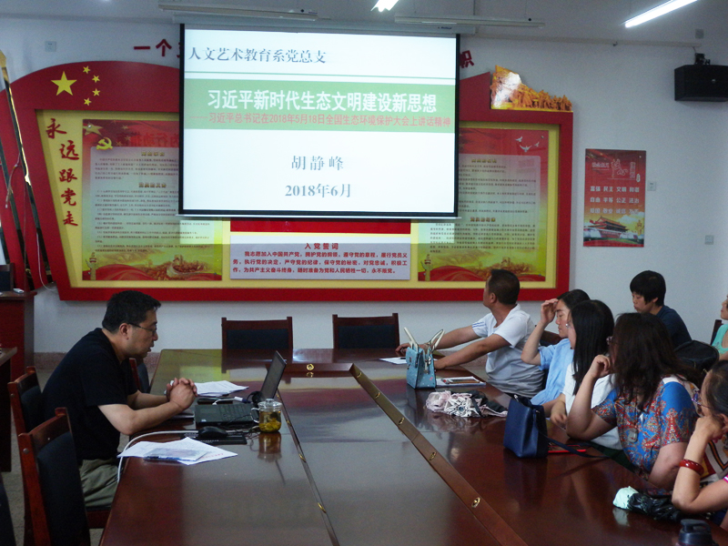 ?? 為深入學(xué)習(xí)習(xí)近平新時代中國特色社會主義思想,人文藝術(shù)教育系黨總支于6月13日下午在勵勤樓209黨員活動室開展書記講黨課活動。黨課由系黨總支書記胡靜峰主講,題目為《習(xí)近平新時代生態(tài)文明建設(shè)新思想》,系全體黨員參加了此次活動。