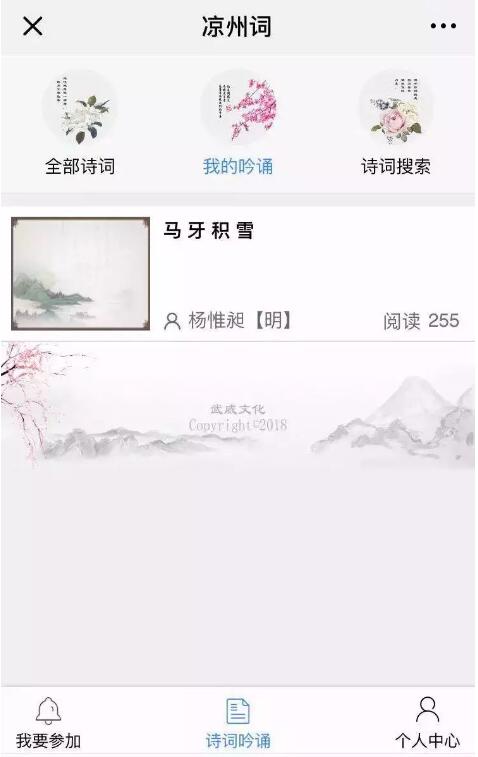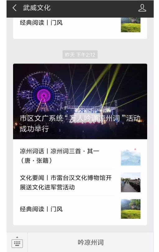 1.打開“武威文化”公眾號,點(diǎn)擊最下方“吟涼州詞”進(jìn)入活動“萬人吟誦涼州詞”活動頁面。
