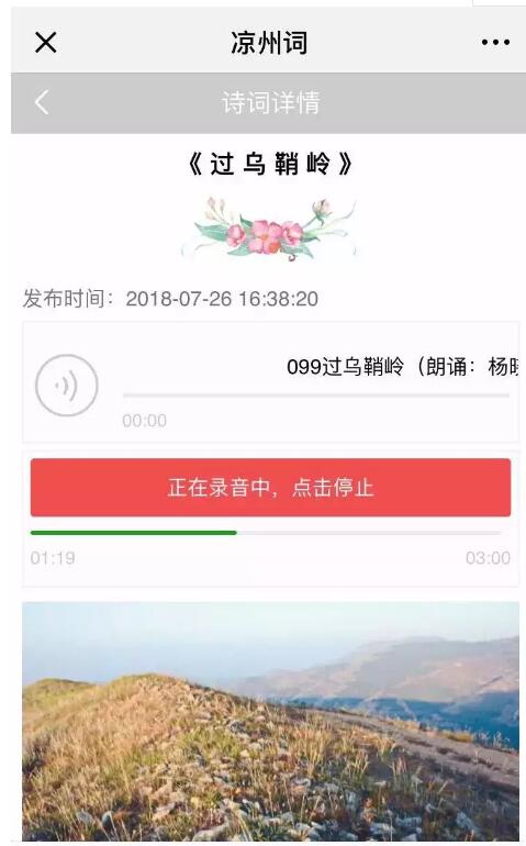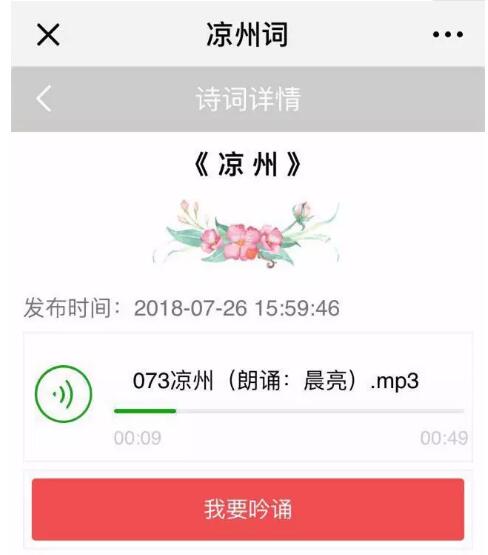 2.單擊自己選定的條目或詩詞名即可進(jìn)入吟誦頁面,點(diǎn)擊”我要吟誦”開始錄入音頻,?吟誦結(jié)束后點(diǎn)擊提交,保存音頻資料即可完成吟誦,已保存的詩詞音頻可在“我的吟誦”列表查看。