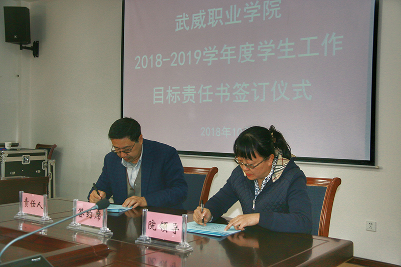 責(zé)任書簽訂儀式上,田迎春代表學(xué)院與各系黨總支書記或負(fù)責(zé)人簽訂了《武威職業(yè)學(xué)院2018-2019學(xué)年度學(xué)生工作目標(biāo)責(zé)任書》。她充分肯定了各系2017-2018學(xué)年的學(xué)生工作,并就我院學(xué)生工作提出了具體要求,一是學(xué)生工作要緊緊圍繞“立德樹人”的根本任務(wù),樹立全院全員育人思想,各系要強化學(xué)生工作管理責(zé)任,增強工作主動性和責(zé)任性,使學(xué)生管理的各項工作更細(xì)、更實;二是各系要在學(xué)生思想政治教育和日常管理工作中堅持誰主管誰負(fù)責(zé)的原則,力求做到“工作規(guī)范化、管理精細(xì)化、服務(wù)人性化”;三是各系及學(xué)工部門在思想上要與學(xué)院保持高度一致,在工作落實上與學(xué)院保持相向而行,切實將目標(biāo)責(zé)任書的承諾轉(zhuǎn)化為抓工作、謀發(fā)展、促改革的具體行動;四是要在就業(yè)創(chuàng)業(yè)上下功夫,促進(jìn)畢業(yè)生就業(yè)率有所提高、就業(yè)質(zhì)量不斷上升;五是各系要繼續(xù)發(fā)揚勇于創(chuàng)新、開拓進(jìn)取的精神,以更飽滿的熱情、更昂揚的斗志、更務(wù)實的作風(fēng)推進(jìn)我院學(xué)生管理工作的科學(xué)發(fā)展。
