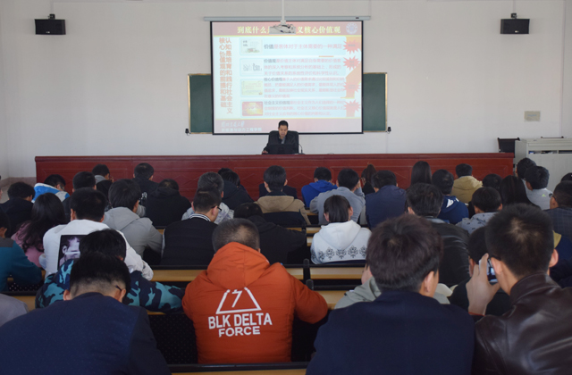 翟存祥從社會主義核心價值觀的時代背景、社會主義核心價值觀的頂層設計、核心價值觀與核心價值體系的關系、社會主義核心價值觀的系統(tǒng)培育、社會主義核心價值觀的全面踐行等五個方面,分析了中國共產黨價值取向的發(fā)展歷程、培育和踐行社會主義核心價值觀的重要性和迫切性,培育和踐行社會主義核心價值觀對實現(xiàn)中國夢的重要現(xiàn)實意義和深遠歷史意義,以及培育和踐行社會主義核心價值觀的措施等問題,并對為什么要培育和踐行、怎么培育和踐行作了系統(tǒng)和精彩的解讀。翟存祥指出,十八大報告將社會主義核心價值觀凝練為24個字:“富強、民主、文明、和諧;自由、平等、公正、法治;愛國、敬業(yè)、誠信、友善”,從國家、社會、個人三個層面,簡單扼要、簡約樸實、簡潔通俗地提出了社會主義核心價值觀的新表達,也為當今中國社會的核心價值觀構建提出了新要求。社會主義核心價值觀既有理論的延續(xù)性,又有現(xiàn)實的針對性;既有目標追求,又有價值導向,還有行為準則,是人心所愿、眾望所歸。翟存祥結合學院發(fā)展實際,要求學生黨員及班團干部從現(xiàn)在做起,從自己做起,努力向上,踐行社會主義核心價值觀,追求有信念,有夢想,有奮斗,有奉獻的人生,讓自己的人生更有意義。