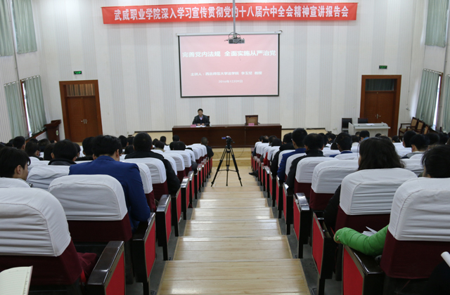 為全面準(zhǔn)確學(xué)習(xí)宣傳黨的十八屆六中全會精神,12月9日上午,學(xué)院在尚德樓正德廳舉辦“深入學(xué)習(xí)宣傳貫徹黨的十八屆六中全會精神宣講報告會”,邀請西北師范大學(xué)教授李玉璧作題為《完善黨內(nèi)法規(guī) 全面實施從嚴(yán)治黨》的宣講報告。學(xué)院副院長王永緒、潘玉華、田迎春,中層干部及師生代表200余人參加報告會。田迎春主持宣講報告會。