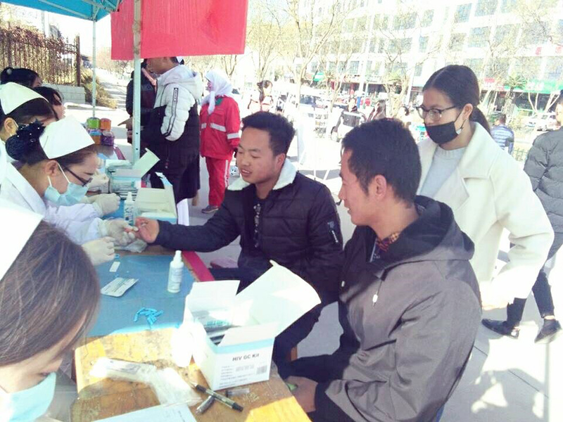 11月17日開始利用周末時(shí)間在武威文化廣場(chǎng)、武威職業(yè)學(xué)院門口等地開展了免費(fèi)檢測(cè)艾滋病與知艾防艾知識(shí)宣傳活動(dòng)?;顒?dòng)吸引了廣大師生及路人,組織井然有序,活動(dòng)場(chǎng)面顯得忙而不亂。在護(hù)理系紅絲帶協(xié)會(huì)志愿者與武威市疾控中心人員嫻熟的操作下,通過(guò)指尖采血,HIV病毒膠體金法檢測(cè),共檢測(cè)了80余人,檢測(cè)速度快,精準(zhǔn)度高。檢測(cè)結(jié)束后,向檢測(cè)者贈(zèng)送活動(dòng)宣傳紀(jì)念品。此次檢測(cè)活動(dòng)采取保密制,保護(hù)檢測(cè)者的一切信息。