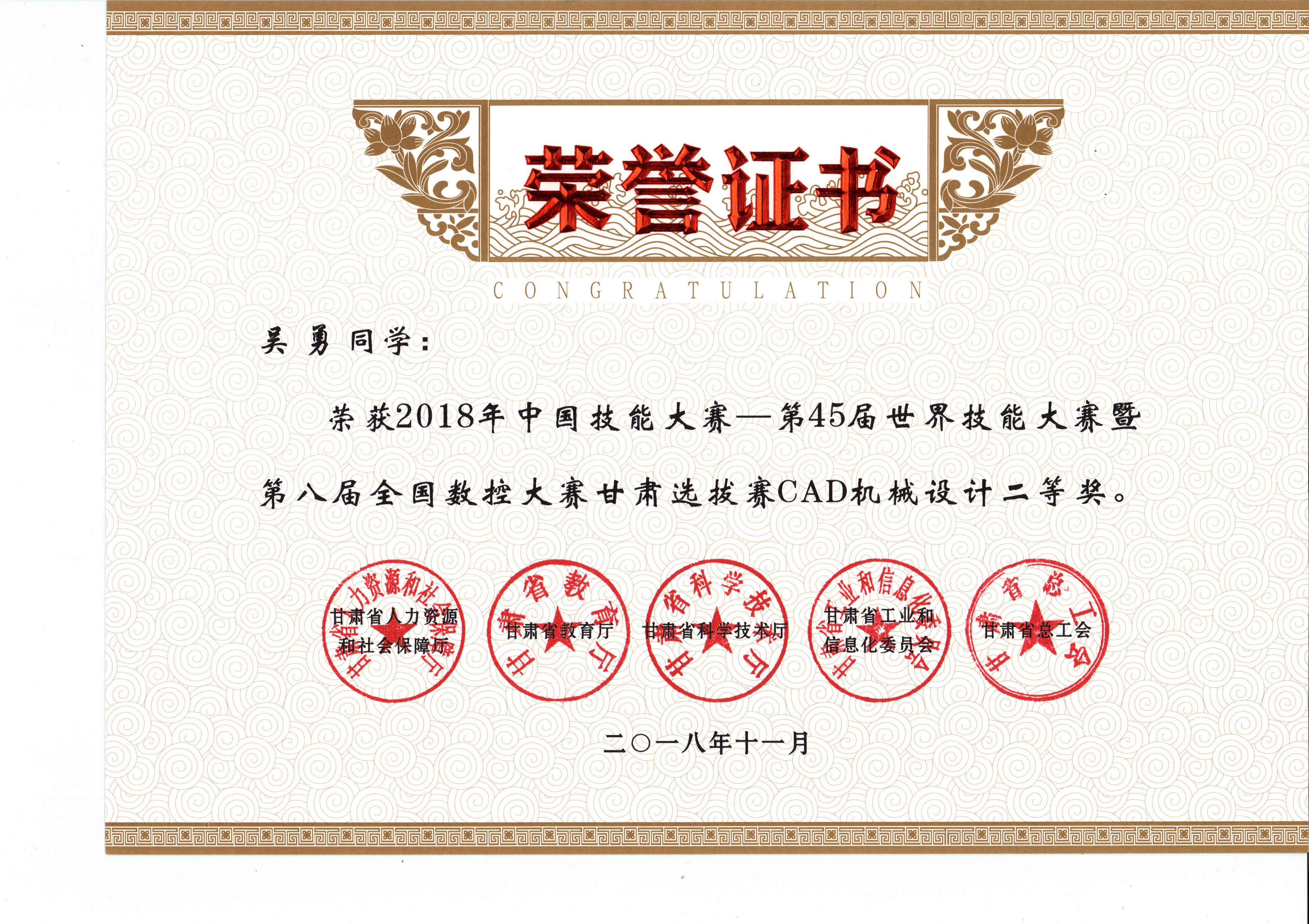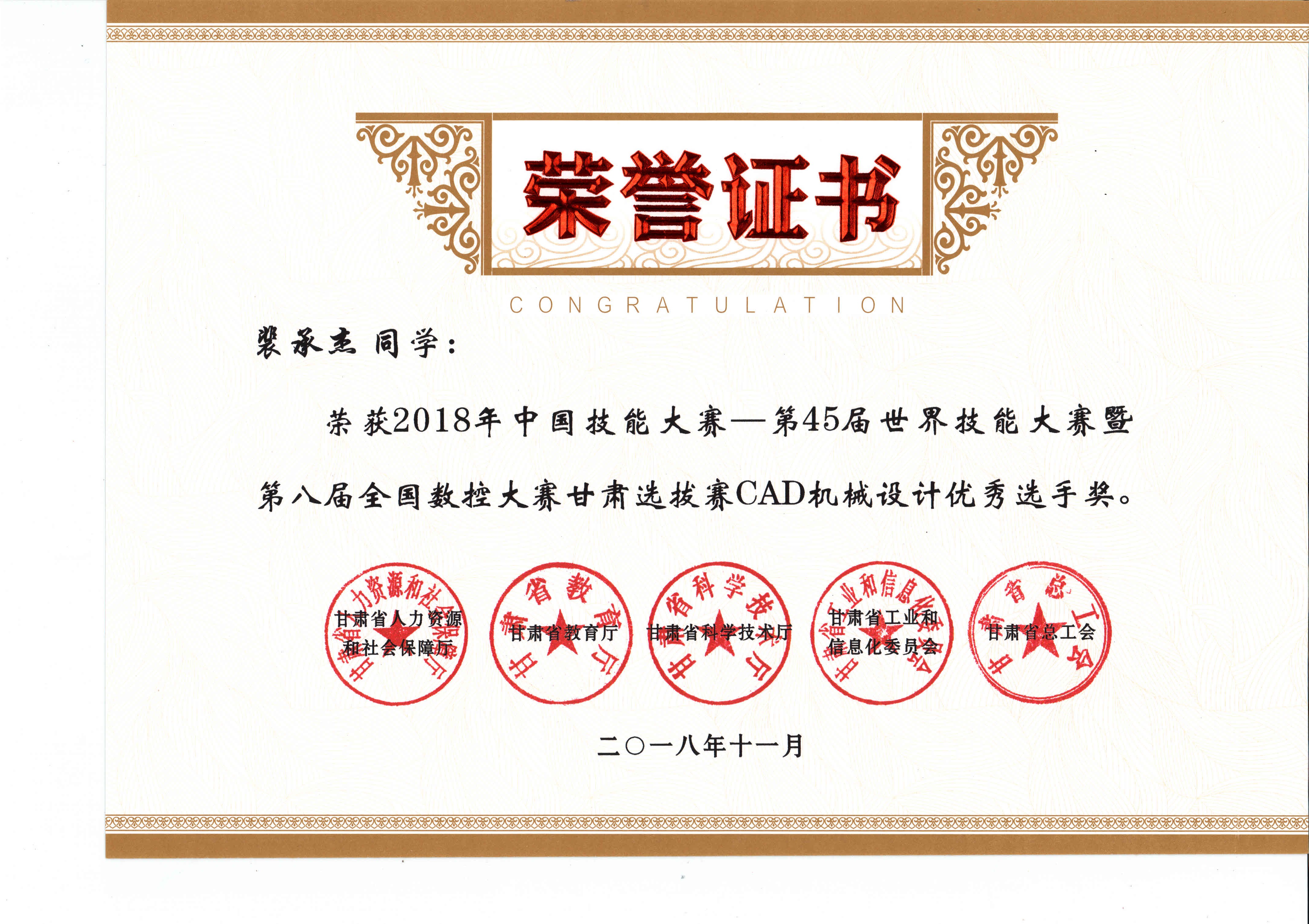 2018年中國技能大賽--第45屆世界技能大賽暨第八屆全國數(shù)控大賽甘肅選拔賽(CAD機(jī)械設(shè)計(jì)項(xiàng)目)獲獎(jiǎng)證書