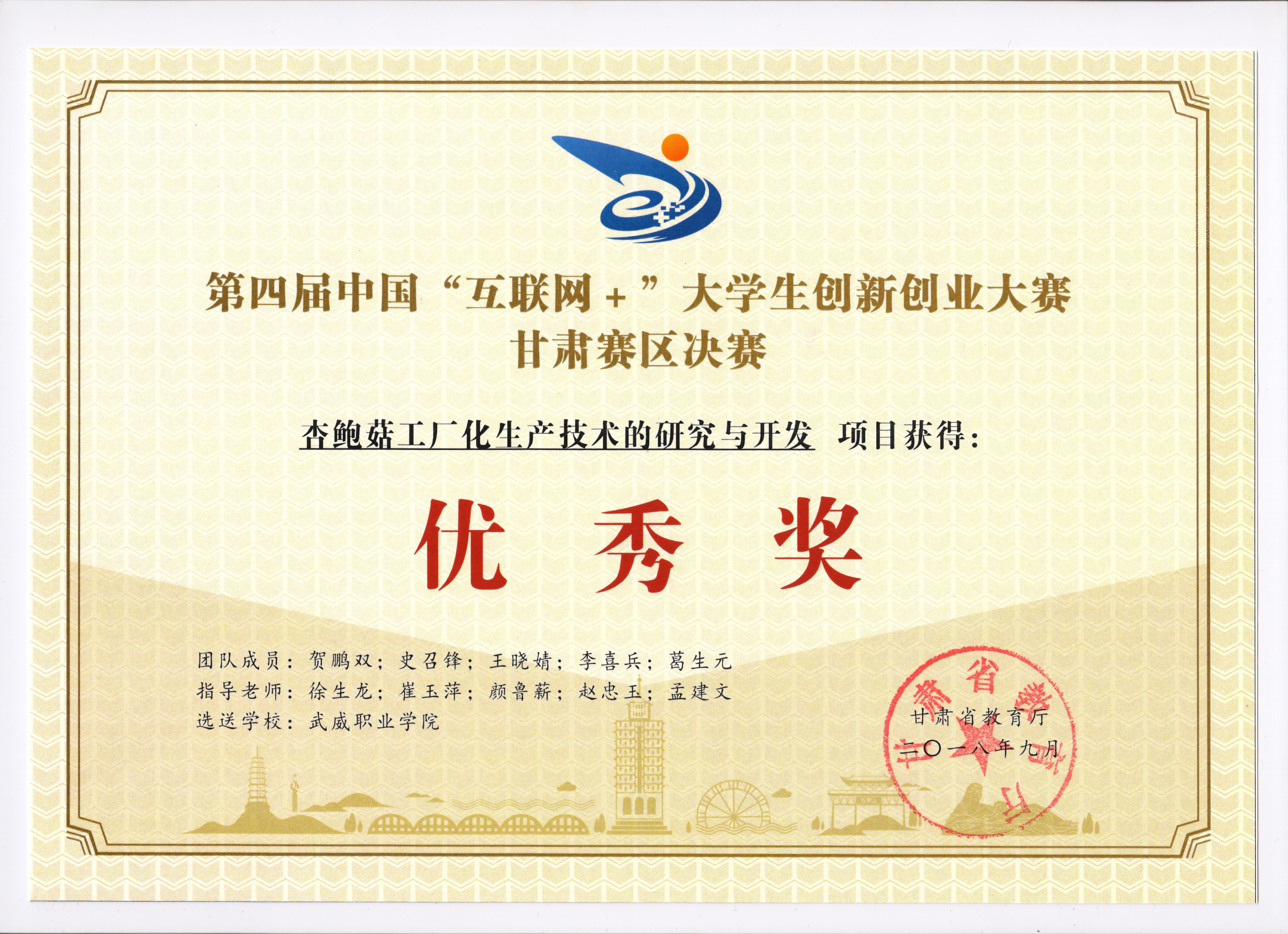 《杏鮑菇工廠化生產(chǎn)技術(shù)的研究與開發(fā)》項(xiàng)目榮獲第四屆中國(guó)“互聯(lián)網(wǎng)+”大學(xué)生創(chuàng)新創(chuàng)業(yè)大賽甘肅賽區(qū)優(yōu)秀獎(jiǎng)