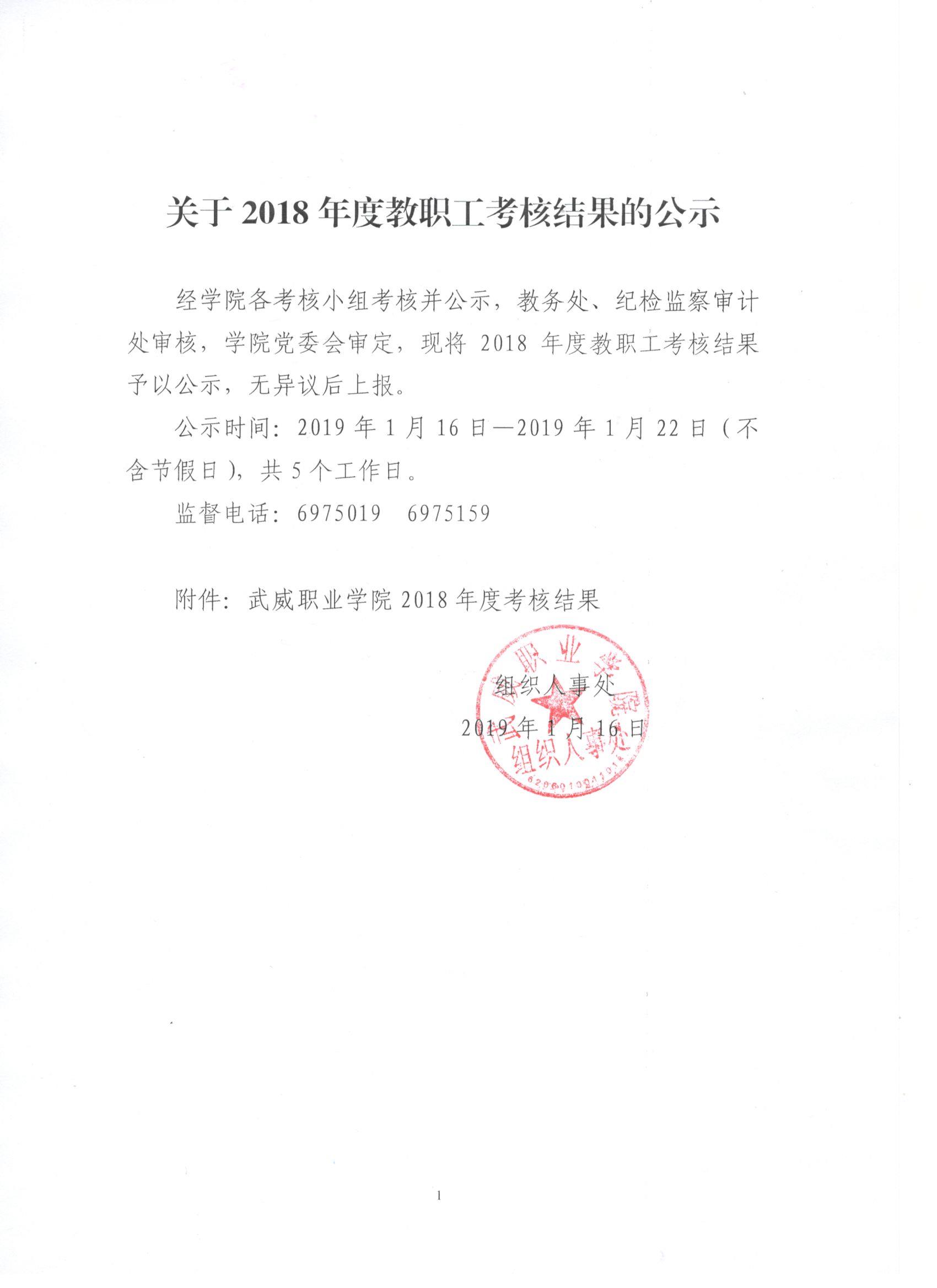 關(guān)于2018年度教職工考核結(jié)果的公示