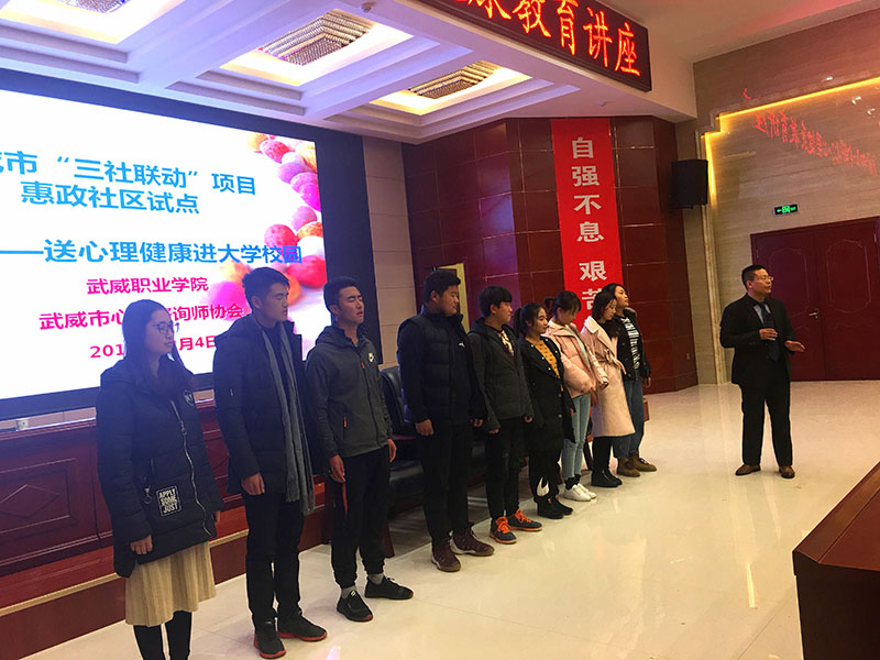 12月4日晚上,學(xué)生工作處聯(lián)合武威市“三社聯(lián)動(dòng)”惠政社區(qū)試點(diǎn)項(xiàng)目在學(xué)院菁英廳舉辦了心理健康專題講座暨心理信息員培訓(xùn)。此次講座邀請(qǐng)武威市心理咨詢師協(xié)會(huì)會(huì)長(zhǎng)何飛老師主講,學(xué)院各系輔導(dǎo)員、2017級(jí)、2018級(jí)班級(jí)心理信息員、心翼心理社團(tuán)會(huì)員等220多人聆聽(tīng)了講座。學(xué)生工作處處長(zhǎng)王守云主持活動(dòng)。