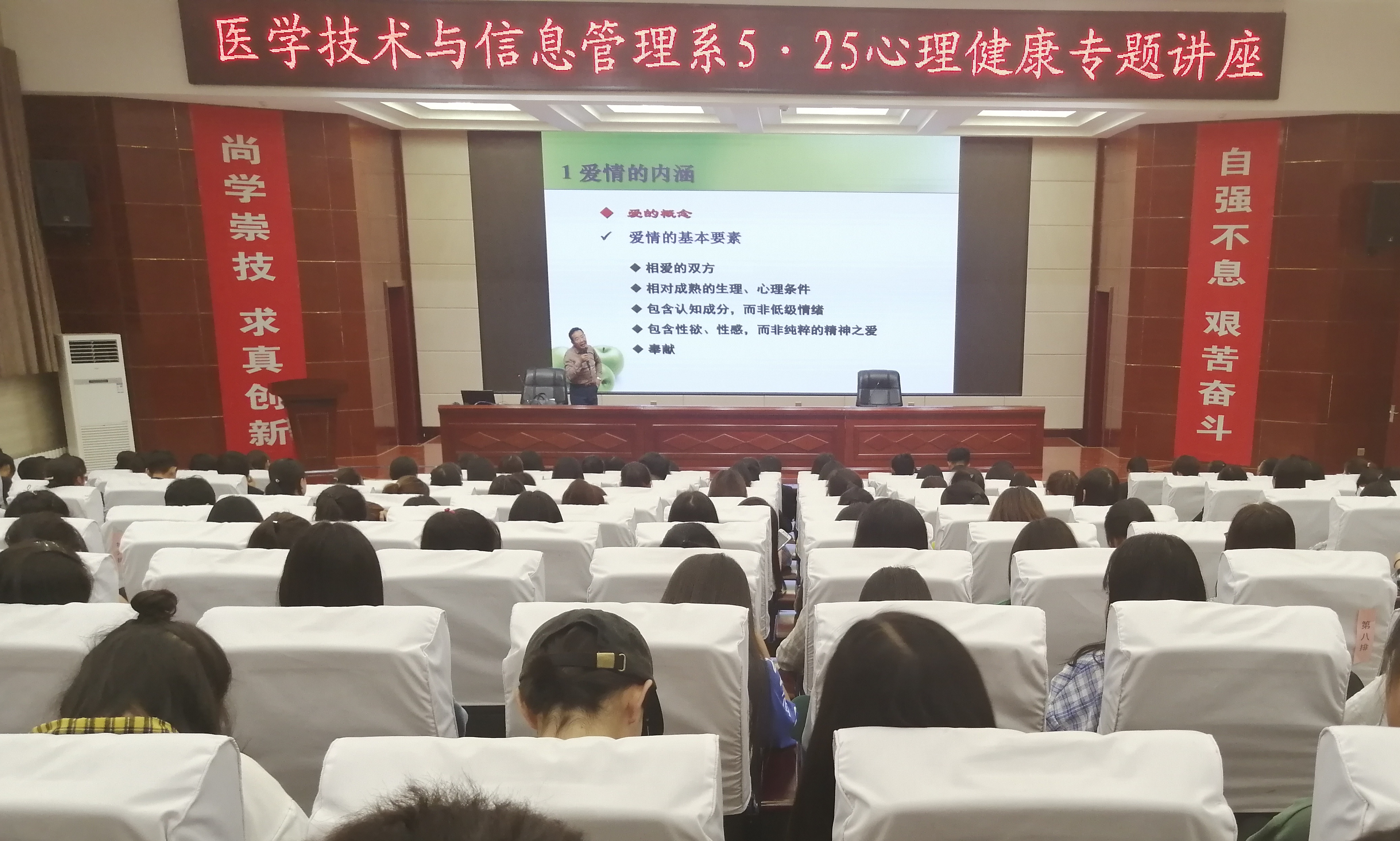 為慶?!?·25”大學(xué)生心理健康日,提升大學(xué)生心理健康意識(shí),增進(jìn)同學(xué)情誼,樹立正確的愛情觀。5月30日晚上,醫(yī)學(xué)技術(shù)學(xué)院在大學(xué)生活動(dòng)中心菁英廳階梯教室舉辦了一場以“彈情說愛,心理漫談”為主題的心理健康知識(shí)講座。講座特邀武威職業(yè)學(xué)院金玉龍主講,我系220名學(xué)生聆聽了講座。