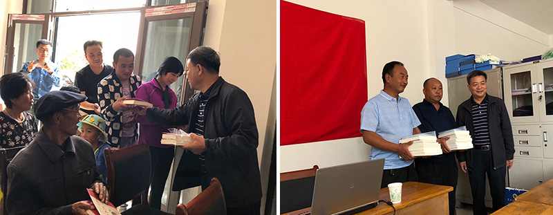 課后,學(xué)院領(lǐng)導(dǎo)把《習(xí)近平新時代中國特色社會主義思想學(xué)習(xí)綱要》《習(xí)近平新時代中國特色社會主義思想三十講》《全國優(yōu)秀共產(chǎn)黨員風(fēng)采錄》《新時代黨支部規(guī)范化建設(shè)工作實用手冊》和“掃黑除惡”知識手冊等14類50多冊黨建書籍分別贈送給蘆草溝村、尚家臺村黨支部和駐村工作隊,還向聽課的村民黨員贈送《習(xí)近平的七年知青歲月》等書籍。進(jìn)村入戶的幫扶干部向幫扶戶村民黨員贈送了黨建書籍。共贈送100多冊價值2700多元黨建書籍和掃黑除惡手冊。