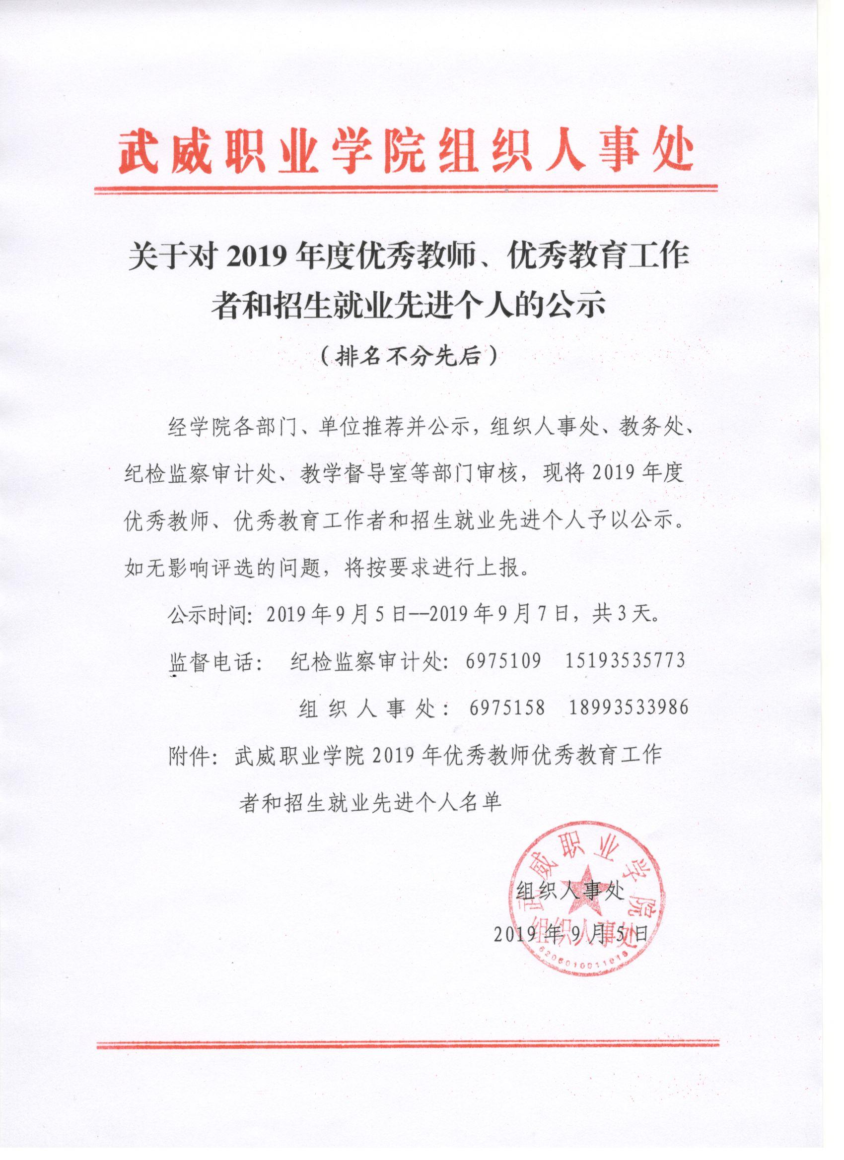 關(guān)于對(duì)2019年度優(yōu)秀教師、優(yōu)秀教育工作者和招生就業(yè)先進(jìn)個(gè)人的公示