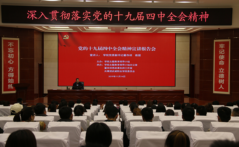 11月14日下午,黨委副書記翟存祥教授在學(xué)院菁英廳作黨的十九屆四中全會精神宣講報告,學(xué)院各教學(xué)系輔導(dǎo)員、學(xué)生黨員、入黨積極分子及學(xué)生干部共兩百余人聆聽了宣講。