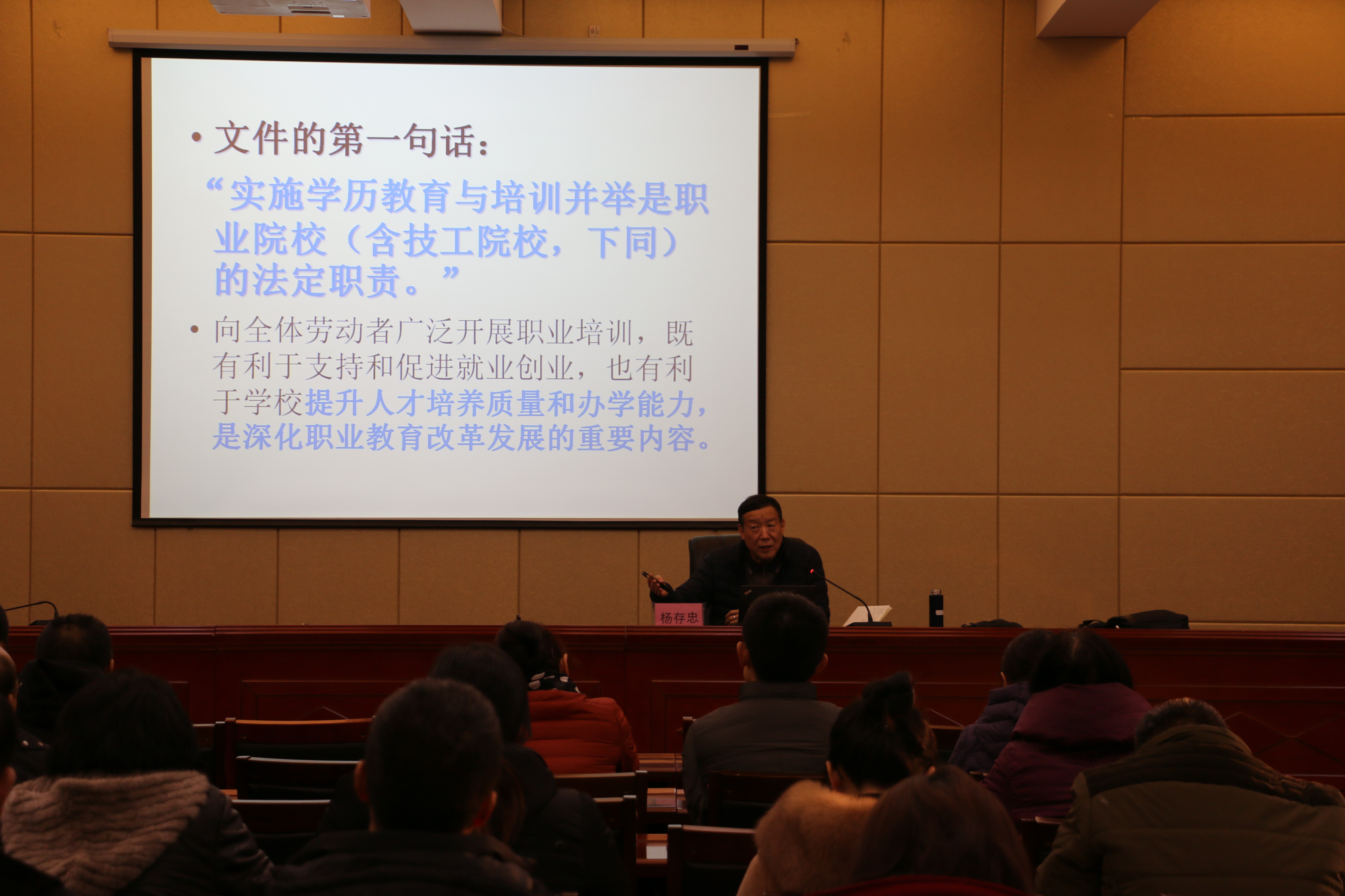 針對教育部11月25日發(fā)布的“關于做好《職業(yè)院校全面開展職業(yè)培訓 促進就業(yè)創(chuàng)業(yè)行動計劃》實施工作有關事項的通知”的文件(以下簡稱《行動計劃》),楊教授從《行動計劃》出臺的背景和意義、職業(yè)院校的法定職責、職業(yè)院校普遍存在的問題、《行動計劃》對職業(yè)院校提出的重點任務和行動措施以及如何推進貫徹落實《行動計劃》等五個方面和大家進行了學習分享。楊教授強調(diào),深化職業(yè)教育改革發(fā)展,職業(yè)院校敞開校門,廣泛開展培訓工作,服務社會發(fā)展,是職業(yè)院校的法定責任,也是學院可持續(xù)發(fā)展和生存的必然趨勢?!缎袆佑媱潯穼β殬I(yè)院校提出了十個方面的行動措施一是廣泛開展企業(yè)職工技能培訓。二是積極開展面向重點人群的就業(yè)創(chuàng)業(yè)培訓。三是大力開展失業(yè)人員再就業(yè)培訓。四是做好職業(yè)指導和就業(yè)服務。五是推進培訓資源建設和模式改革。六是加強培訓師資隊伍建設。七是支持多方合作共建培訓實訓基地。八是完善職業(yè)院校開展培訓的激勵政策。九是健全參訓人員的支持鼓勵政策。十是建立培訓評價與考核機制。楊教授希望大家能夠?qū)W好文件并認真思考學院的改革發(fā)展。把立德樹人、服務發(fā)展、促進就業(yè)、適應需求的辦學理念傳承下去。