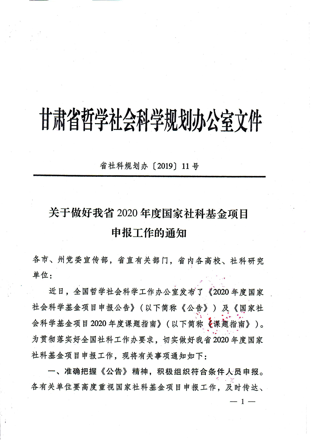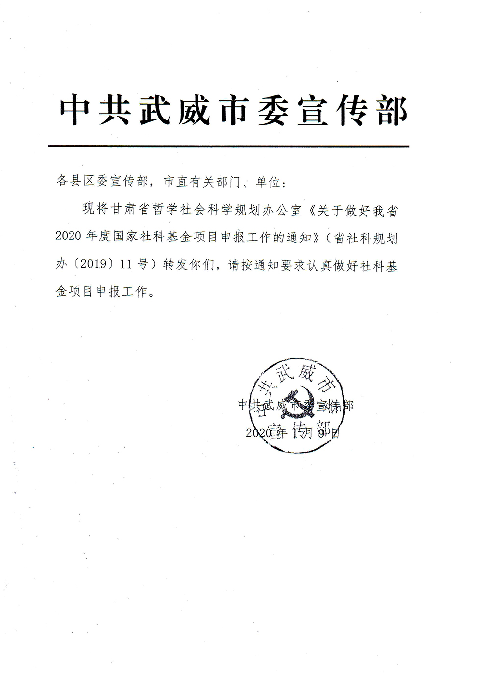 轉(zhuǎn)發(fā)中共武威市委宣傳部《關于做好甘肅省2020年度國家社科基金項目申報工作的通知》
