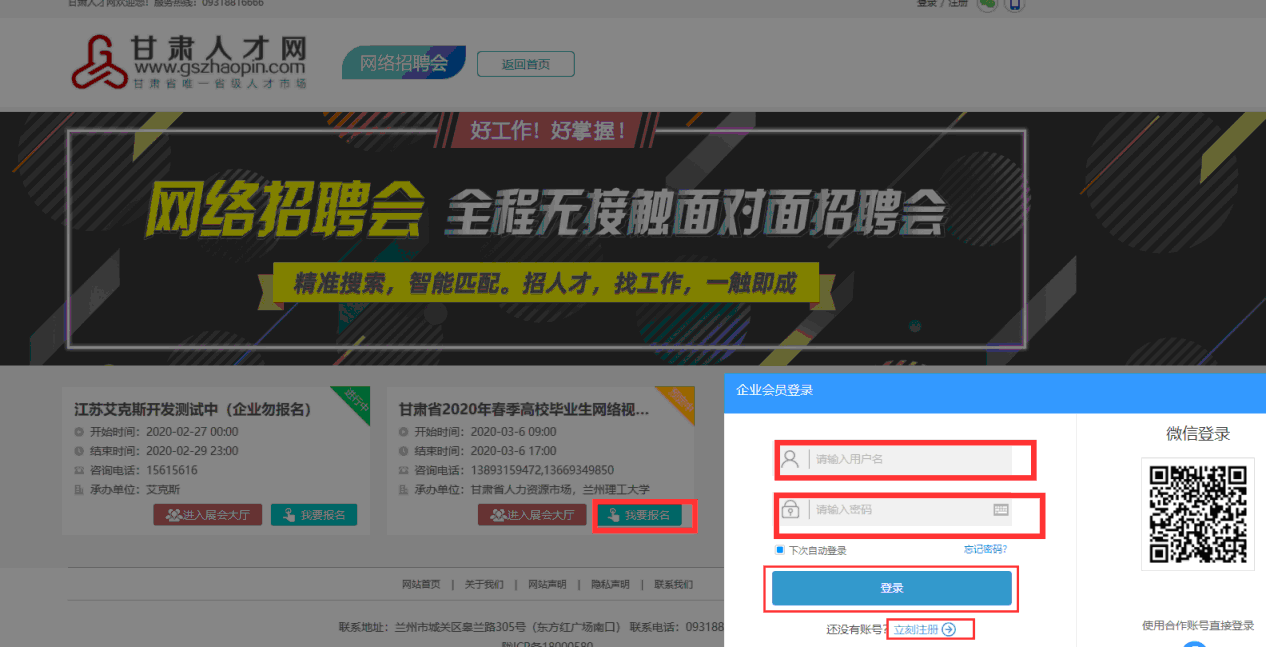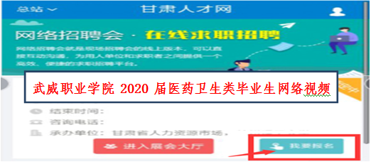 1.登錄甘肅人才網(www.gszhaopin.com),點擊菜單欄“招聘會”—“網絡招聘會”進入二級頁面菜單,進入網絡招聘會列表—選擇“武威職業(yè)學院2020屆醫(yī)藥衛(wèi)生類畢業(yè)生網絡視頻雙選會”點擊“我要報名”按鈕,登錄企業(yè)后臺(無賬號點擊“立即注冊”,資質通過審核后再報名),待定審核。