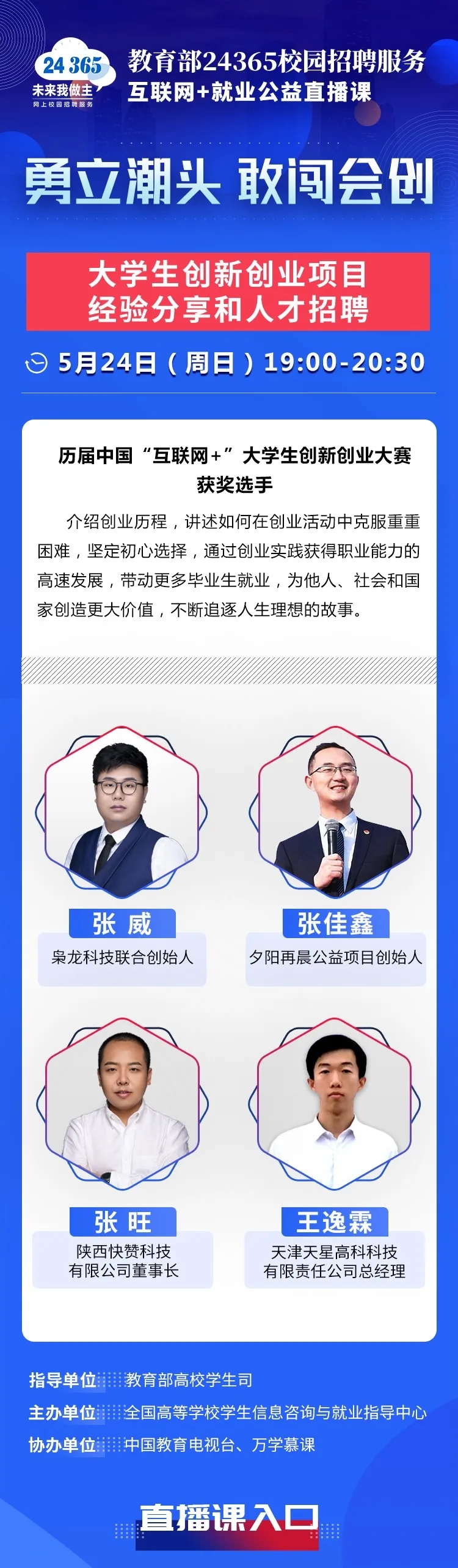 教育部24365就業(yè)公益課程:勇立潮頭 敢闖會(huì)創(chuàng)——大學(xué)生創(chuàng)新創(chuàng)業(yè)項(xiàng)目經(jīng)驗(yàn)分享和人才招聘