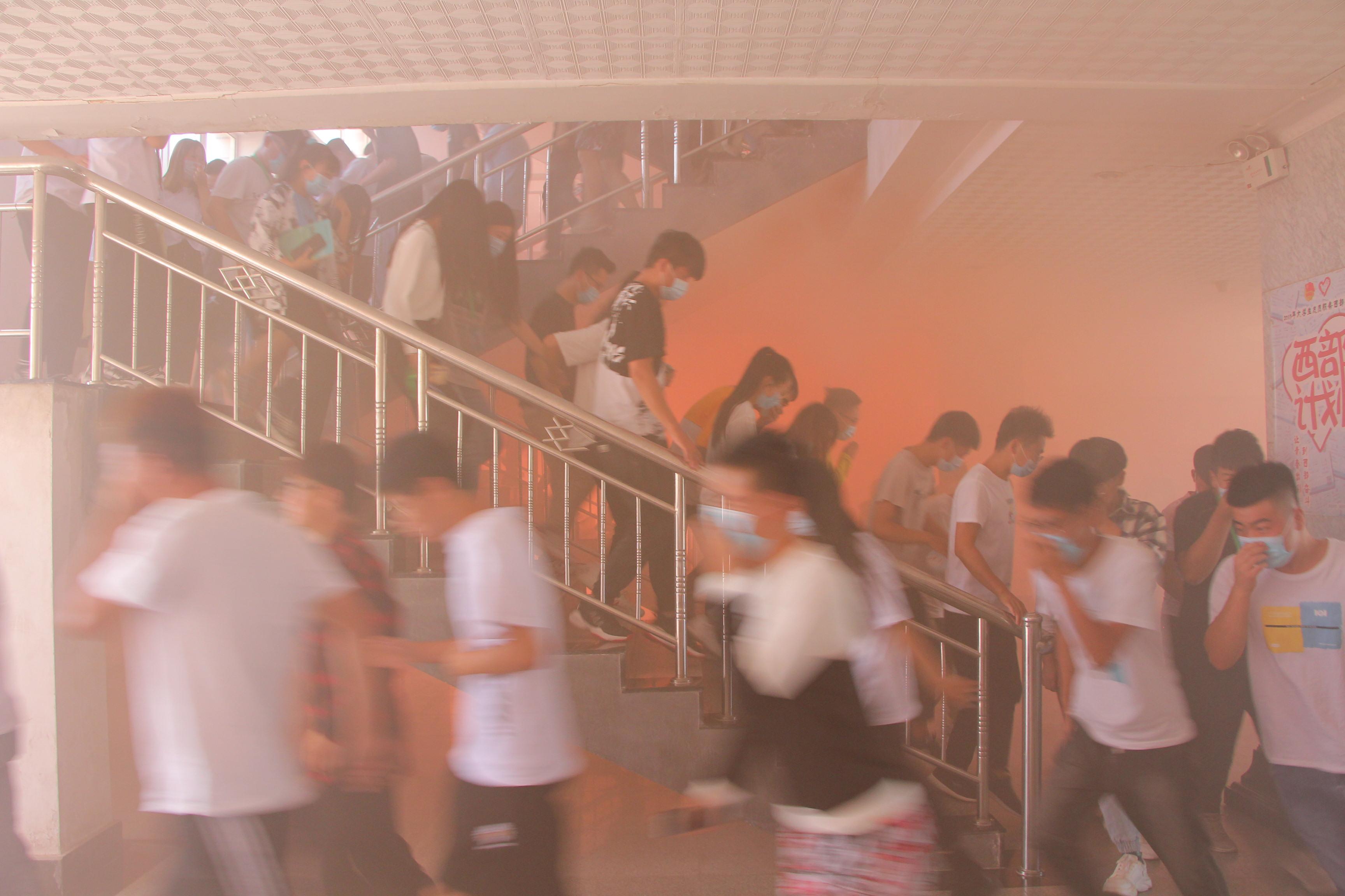 下午4點46分,疏散演練正式開始。隨著消防警報響起,各教學班上課教師立即停止上課組織學生疏散,學生用濕毛巾捂住口鼻,按照逃生路線有序疏散。在3分鐘內(nèi),6000多名參演師生全部撤離到了安全地帶,演練取得圓滿成功。