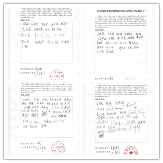 ??對學(xué)生進(jìn)行校園不良網(wǎng)貸和電信網(wǎng)絡(luò)詐騙的風(fēng)險告知和防范引導(dǎo)等方面的安全與警示教育,讓學(xué)生了解電信詐騙、不良網(wǎng)絡(luò)貸款等詐騙的類型、危害及防范知識技能。自愿簽訂拒絕不良網(wǎng)貸和防范電信網(wǎng)絡(luò)詐騙承諾書。