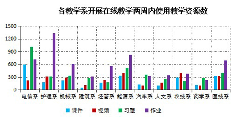 開展在線教學(xué)兩周以來,通過學(xué)院在線教學(xué)平臺管理后臺數(shù)據(jù)整理分析,教師為在線授課準(zhǔn)備了充足的教學(xué)資源。兩周內(nèi),學(xué)院教學(xué)平臺新上傳教學(xué)課件2527個,教學(xué)視頻2701個;新設(shè)置課堂練習(xí)題4176道,發(fā)布課后作業(yè)題6375道,豐富的資源有力支持在線教學(xué)順利進(jìn)行。
