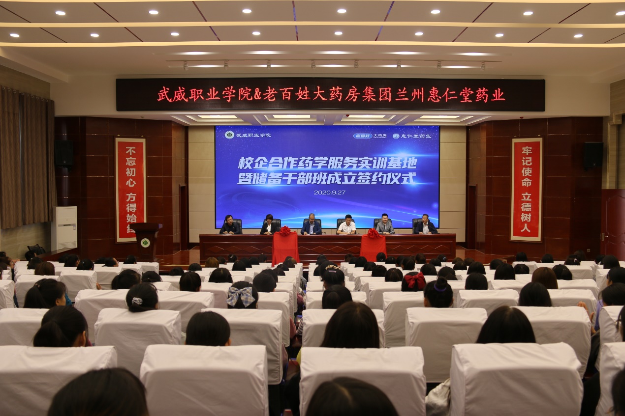 2020年9月27日上午,學(xué)院與老百姓集團(tuán)﹒蘭州惠仁堂藥業(yè)連鎖有限責(zé)任公司“校企共建藥學(xué)實(shí)訓(xùn)基地”暨“老百姓儲(chǔ)備干部班”成立簽約儀式在大學(xué)生活動(dòng)中心菁英廳舉行。儀式由藥學(xué)系主任魏潤(rùn)明主持,學(xué)院黨委副書(shū)記翟存祥、老百姓集團(tuán)總部和蘭州惠仁堂藥業(yè)公司相關(guān)領(lǐng)導(dǎo)出席,藥學(xué)系教師代表和2019級(jí)藥學(xué)、中藥學(xué)專業(yè)學(xué)生代表共計(jì)220人參加了簽約儀式。
