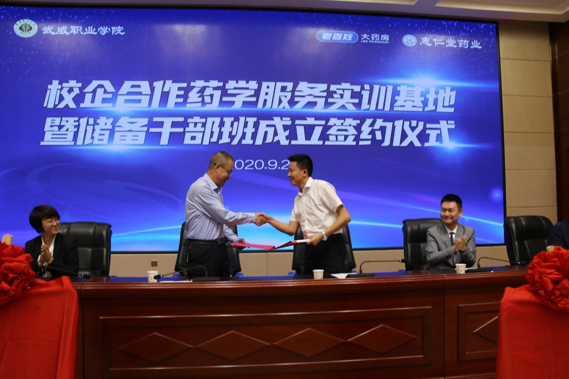隨后,雙方領(lǐng)導(dǎo)簽署了校企合作協(xié)議,共同為“校企共建藥學(xué)實(shí)訓(xùn)基地”和“老百姓儲(chǔ)備干部班”進(jìn)行了授牌。