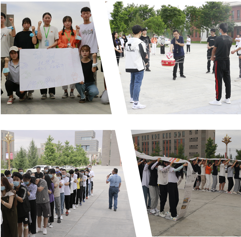 6月19日、6月20日下午在大學(xué)生活動(dòng)中心前廣場(chǎng)開展“釋放壓力、放飛心靈”素質(zhì)拓展活動(dòng)?;顒?dòng)包括破冰、團(tuán)隊(duì)建設(shè)、風(fēng)火輪大PK、同心協(xié)力創(chuàng)輝煌(鼓動(dòng)人心)、分享五個(gè)環(huán)節(jié)。