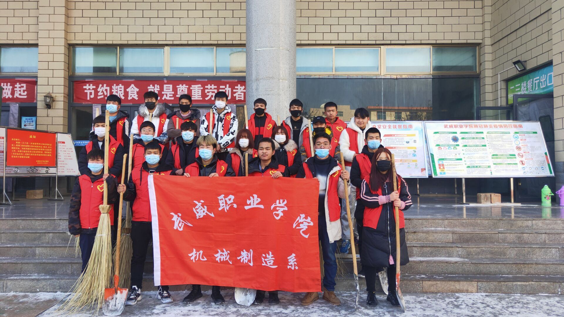 本次鏟雪的區(qū)域是教學樓區(qū)域的主干道和食堂門前道路。寒冷的天氣擋不住大家的勞動熱情,厚厚的冰塊蓋不住大家的志愿精神。鐵鍬聲此起彼伏,大家分工明確,相互合作,現(xiàn)場氣氛熱烈。經過多小時的勞動,大家將教學樓前主干道積雪基本清掃干凈。