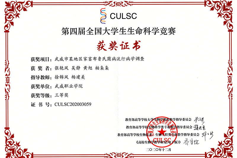 近日,第四屆全國大學(xué)生生命科學(xué)競賽落下帷幕,經(jīng)過激烈角逐,我院推薦參賽的兩個項目獲得全國二等獎三等獎,學(xué)院成為省內(nèi)獲得此次全國比賽獎項的唯一高職院校。在此前舉辦的甘肅賽區(qū)比賽中,我院兩個項目獲得甘肅省一等獎1項,二等獎1項,被推薦參加全國總決賽。此次獲得全國競賽獲獎不僅填補了我院學(xué)生在全國競賽中獲獎的空白,也為學(xué)院創(chuàng)建“雙高”院校增添了重要成果。