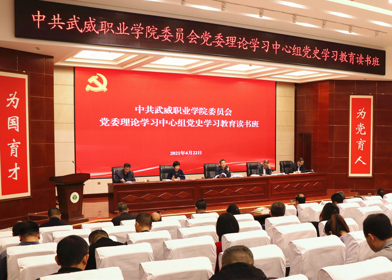 專題輔導(dǎo),在重溫歷史中凝聚奮進(jìn)力量讀書班于4月22日下午邀請中共武威市委黨校講師、市黨史學(xué)習(xí)教育宣講團(tuán)成員魏樂儀以《中國共產(chǎn)黨應(yīng)對風(fēng)險挑戰(zhàn)的經(jīng)驗(yàn)啟示》為題,從強(qiáng)國征程、黨史開篇,百年大黨的深沉歷史自覺;危中尋機(jī)、困中破局,黨應(yīng)對風(fēng)險挑戰(zhàn)的歷史進(jìn)程;以史為鏡,以史明志,推進(jìn)偉大歷史偉業(yè)三個方面給參加讀書班的黨員干部和師生作了一場精彩的專題輔導(dǎo)。黨員干部和師生紛紛表示,中國共產(chǎn)黨的一百年,是歷經(jīng)艱難險阻、克服各種困難、最終走向輝煌的歷史,是一部不懈奮斗史、理論探索史、自身建設(shè)史,蘊(yùn)含十分豐富的教育資源。我們要從中汲取奮斗力量,克服影響制約學(xué)院發(fā)展的困難問題,推進(jìn)“雙高計(jì)劃”院校建設(shè),以更加優(yōu)異成績迎接中國共產(chǎn)黨成立100周年。