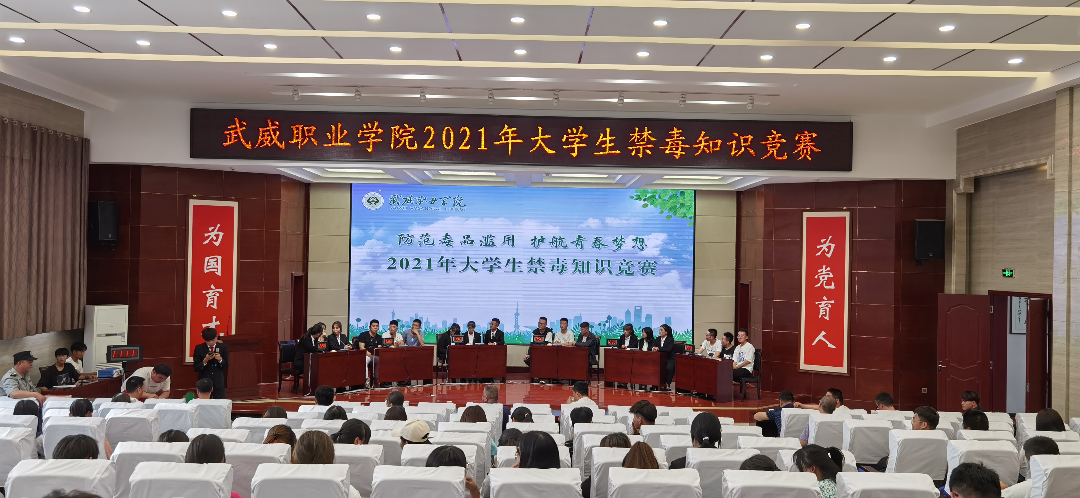 為加強在校大學生禁毒知識普及教育,深入推進青少年毒品預防教育“6.27”工程,7月5日下午,學院在菁英廳舉辦以“防范毒品濫用,護航青春夢想”為主題的2021年大學生禁毒知識競賽決賽。學院黨委委員、副院長王守云出席活動。各教學院系200多名師生觀看了比賽。