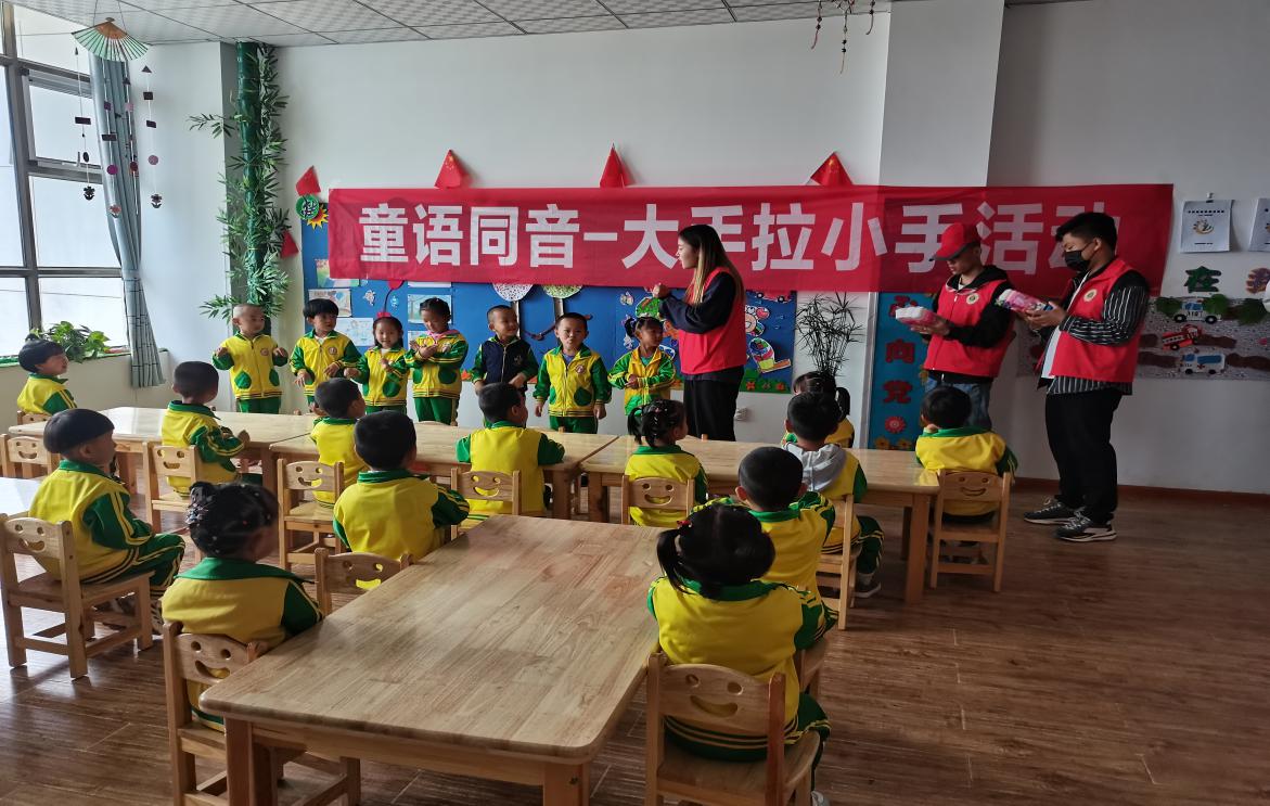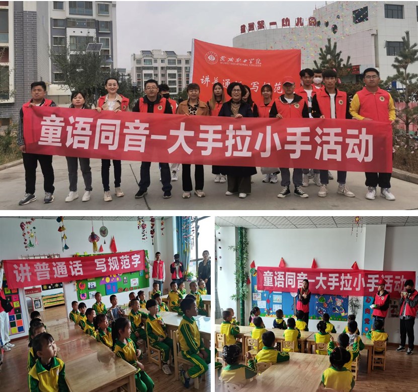 為認(rèn)真貫徹落實《教育部等九部門關(guān)于開展第24屆全國推廣普通話宣傳周活動的通知》(教語用函〔2021〕1號)、《甘肅省語言文字工作委員會等九部門關(guān)于開展第24屆全國推廣普通話宣傳周活動的通知》要求,進(jìn)一步加大國家通用語言文字推廣力度,9月14日,學(xué)院推普志愿隊師生在古浪綠洲小鎮(zhèn)第一幼兒園開展童語同音-大手拉小手推普活動,推普志愿隊詳細(xì)了解小鎮(zhèn)幼兒教師及兒童的普通話普及情況,并與大、中班幼兒進(jìn)行了有趣的互動活動。