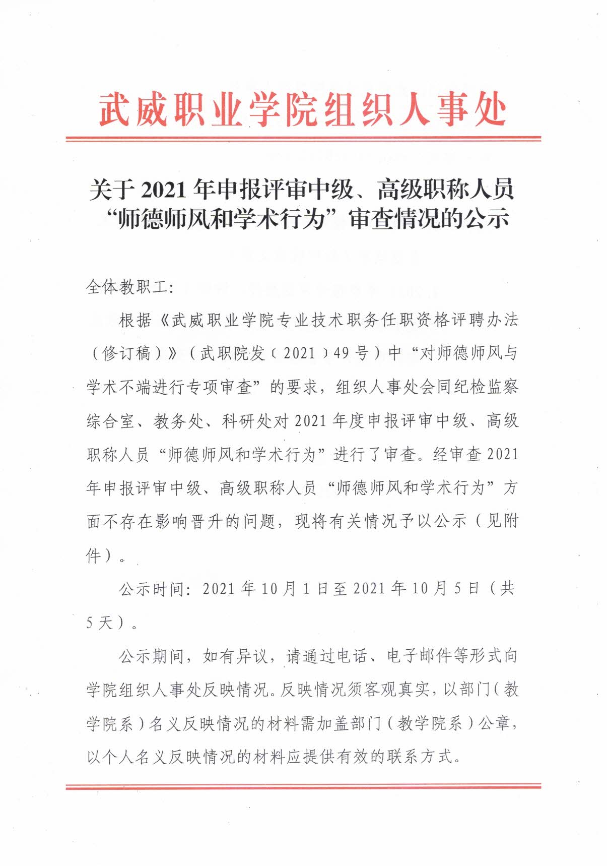 關于2021年申報評審中級、高級職稱人員“師德師風和學術行為”審查情況的公示