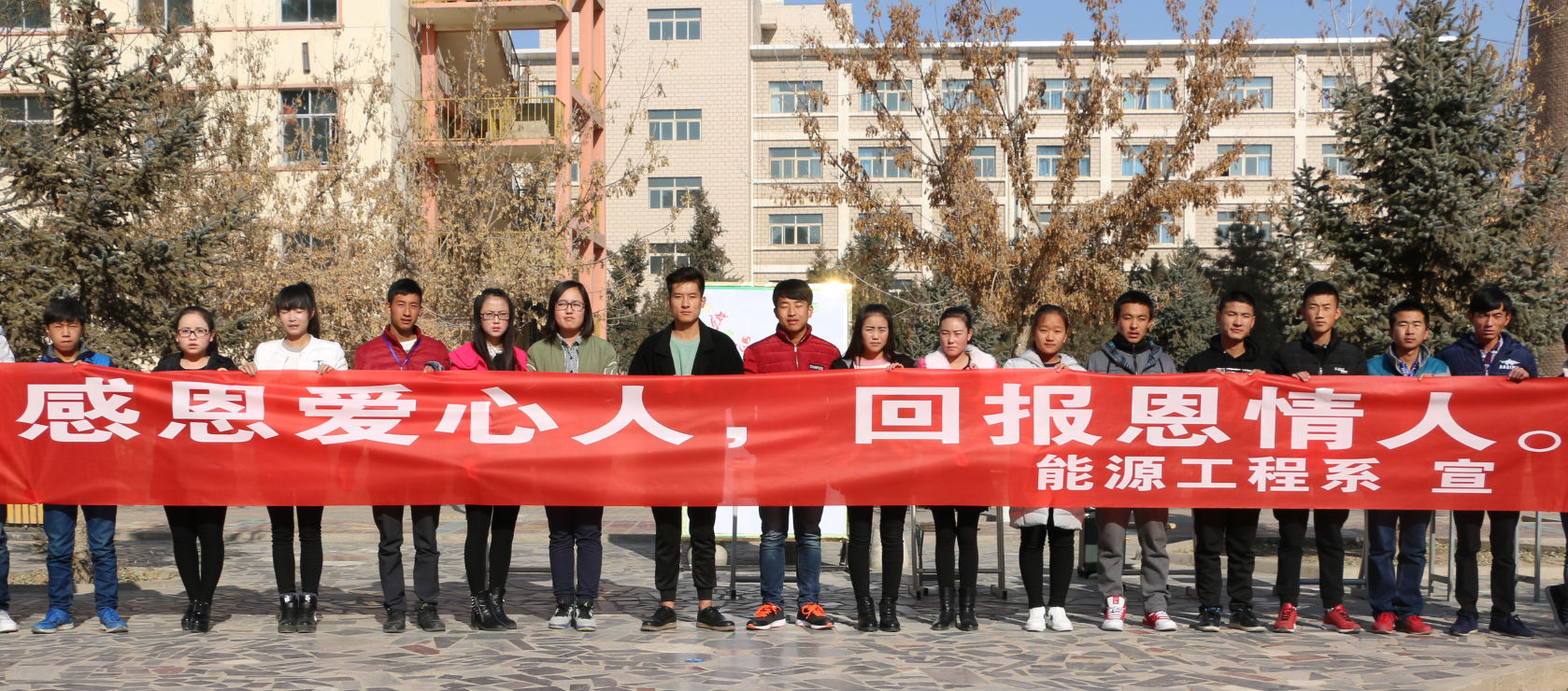 為了成長為合格的祖國建設(shè)者,為實現(xiàn)中國夢。2016年11月24日,武威職業(yè)學(xué)院能源工程系在一號食堂門口,舉行了以“感恩愛心人,回報恩情人”為主題的活動,出席本次活動的有能源工程系全體學(xué)生會成員。
