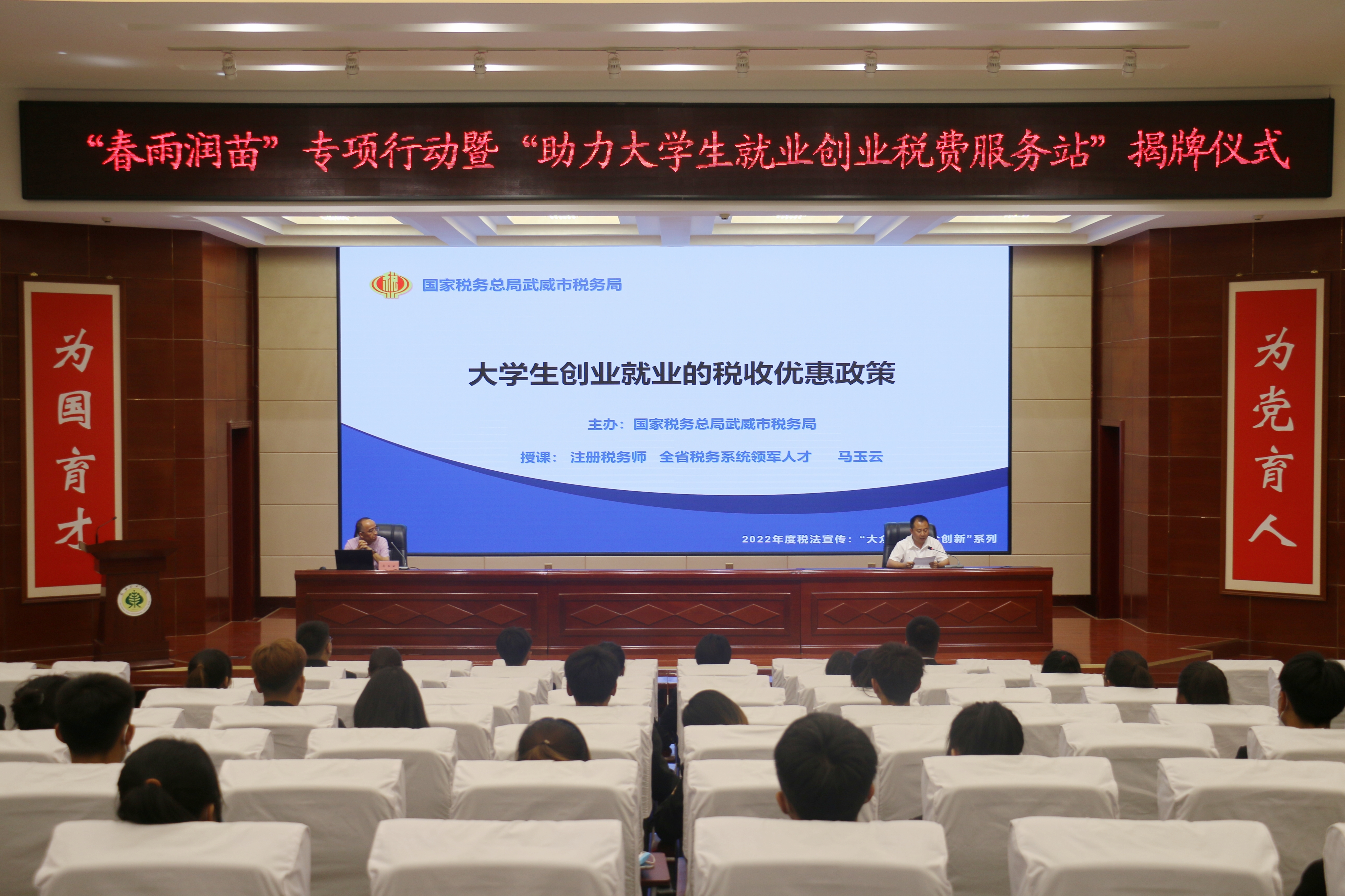 揭牌儀式結(jié)束后,武威市稅費專家顧問團(tuán)隊代表馬玉云為學(xué)校師生帶來“就業(yè)創(chuàng)業(yè)稅費第一課”的報告,向大學(xué)生們普及稅法知識,特別針對高校畢業(yè)生就業(yè)創(chuàng)業(yè)稅費優(yōu)惠政策、組合式稅費支持政策、個人所得稅政策以及社保繳納等內(nèi)容進(jìn)行了詳細(xì)解讀,為大學(xué)生創(chuàng)業(yè)就業(yè)新苗送上一場“及時雨”。