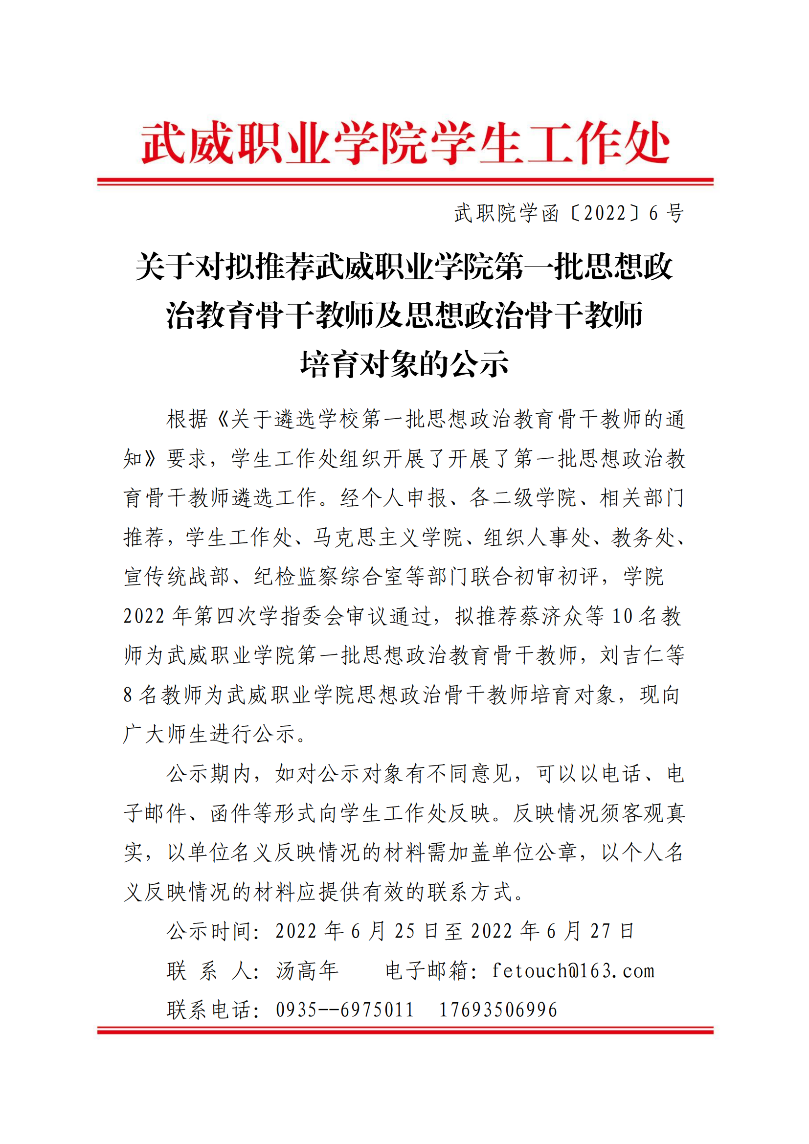 關于對擬推薦武威職業(yè)學院第一批思想政治教育骨干教師及思想政治骨干教師培育對象的公示