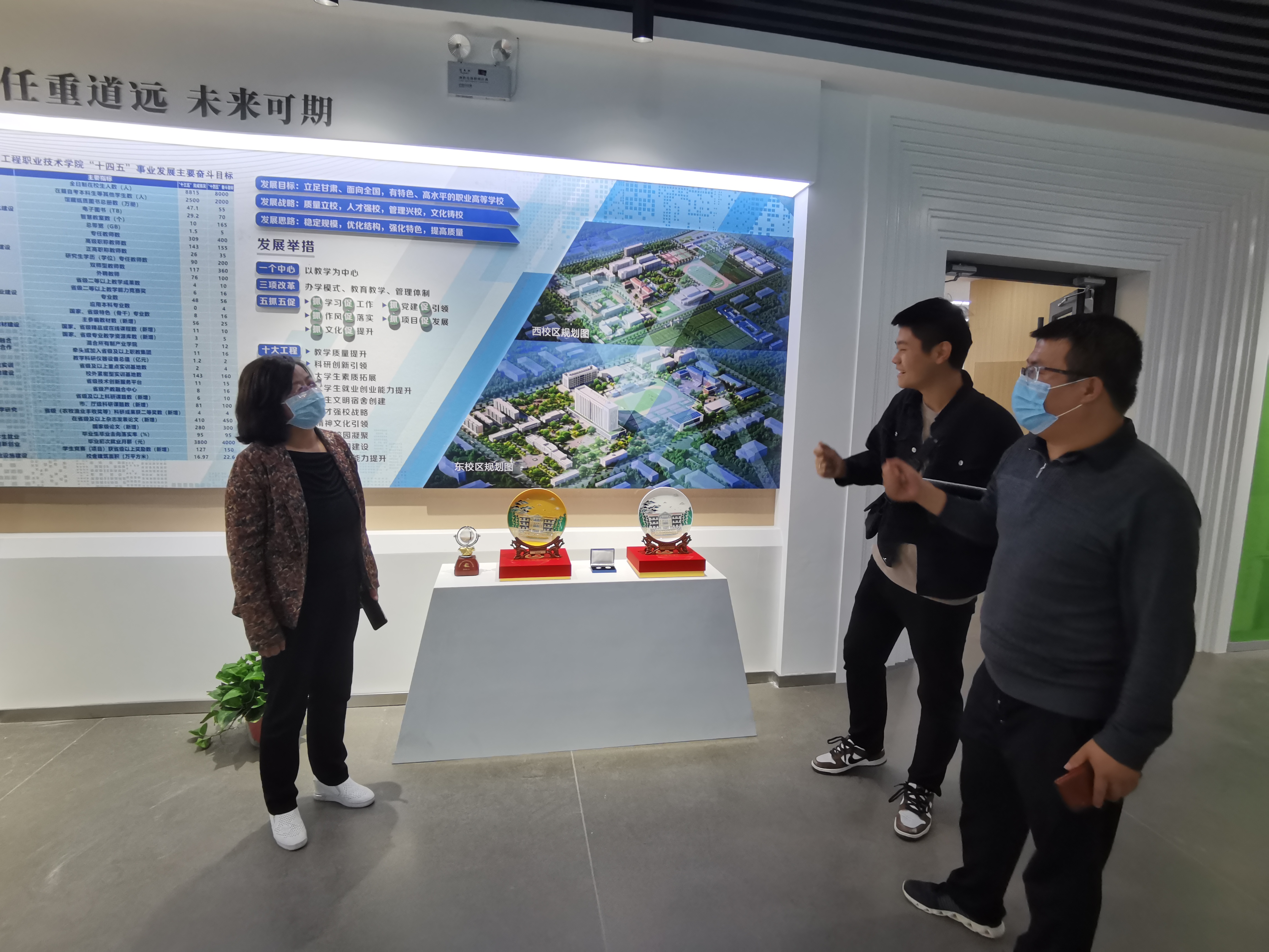 為全面推進“雙高計劃”學校建設,提升圖書館服務水平,營造“書香校園”,將圖書館打造成人性化、智能化、專業(yè)化的綠色學習空間。近日,圖書館館長楊如松、副館長蔡濟眾、館員楊建盛三人到甘肅省畜牧工程職業(yè)技術(shù)學院圖書館考察學習,在甘肅省畜牧工程職業(yè)技術(shù)學院圖書館館長解玉寶陪同下,參觀了該校圖書館讀書吧、校史館、黨史館、“挑戰(zhàn)杯”獲獎作品展覽館等處,解玉寶講解了該館設計理念及建設過程中的側(cè)重點和展示重點。楊如松就現(xiàn)在圖書館裝發(fā)展趨勢、圖書館管理辦法、學生借閱量等實際問題同解玉寶進行了相互交流。