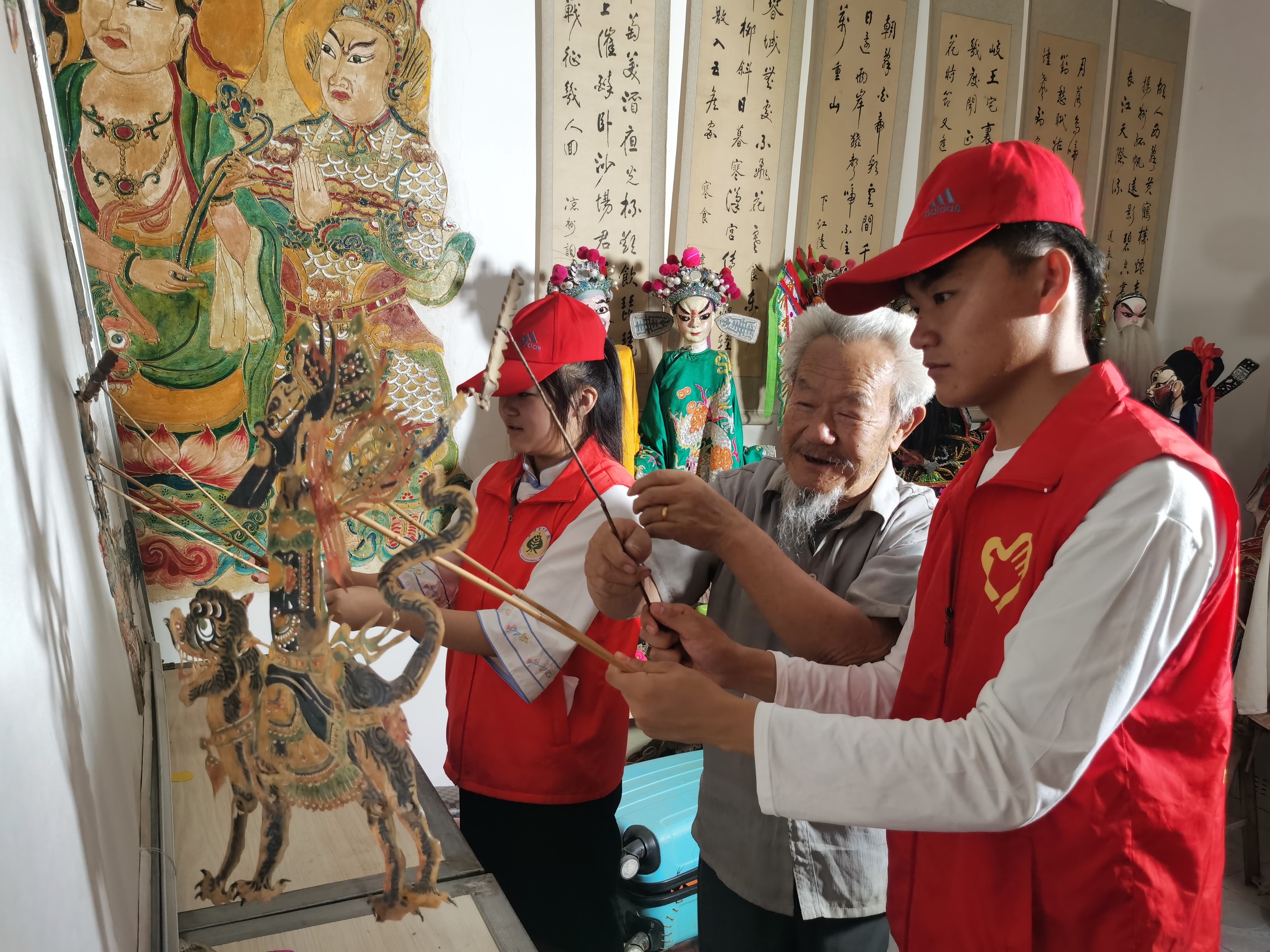初訪老藝人,馬登岐老人告訴實(shí)踐隊(duì)員,他5歲開始就跟著爺爺去十里八鄉(xiāng)唱木偶劇、演皮影戲。沒想到,這一演就演了86年。家里的400余件木偶、皮影及木偶人物的道具、服裝都是靠自己雕刻、染色、縫制的,制作一個(gè)完整的人物得用一周時(shí)間。如今,他家里還珍藏著明清時(shí)期的皮影和木偶頭像。