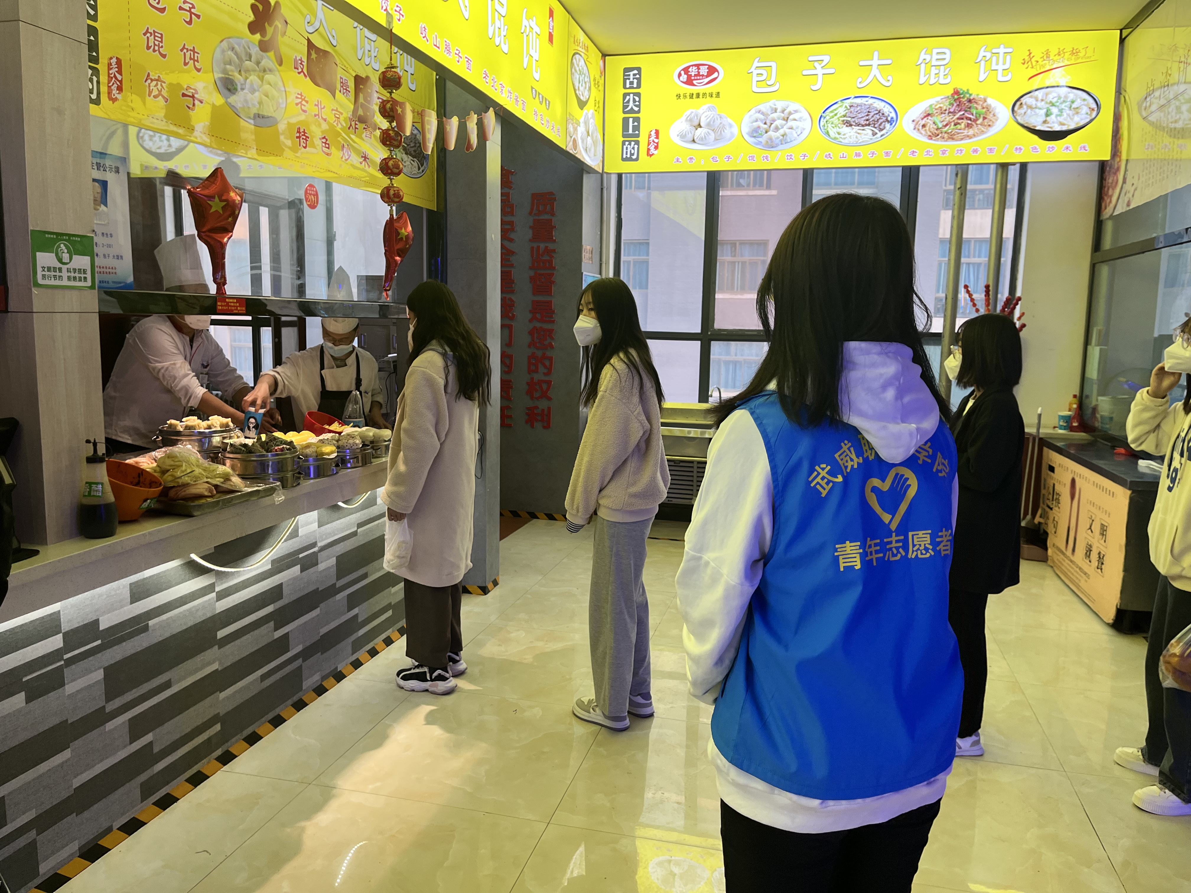 從學校實行最小單元宿舍管理開始,各學生組織工作人員分批次、不間斷、輪流值守,他們主動亮身份、帶頭當先鋒,在校園食堂、水房、超市等人流容易聚集的地方,每天安排志愿者在人流高峰時間段排班站崗,勸導同學們遵守疫情防控一米線,不扎堆不聚集,積極佩戴好口罩,做好個人防護工作,確保同學們吃飯、購物、打水健康有序進行。在對可能傳入疫情的校園圍欄處開展值守勸阻工作,積極勸導學生不購買社會面商品,堅決杜絕疫情從社會傳入校園,將學校疫情防控各項措施落細落實,切實扛起校園疫情防控責任。一件件“藍馬甲”活躍在校園每個角落,服務同學的身影從未間斷,成為校園里一道靚麗的風景線,用實際行動詮釋了新時代武職學子的責任與擔當。