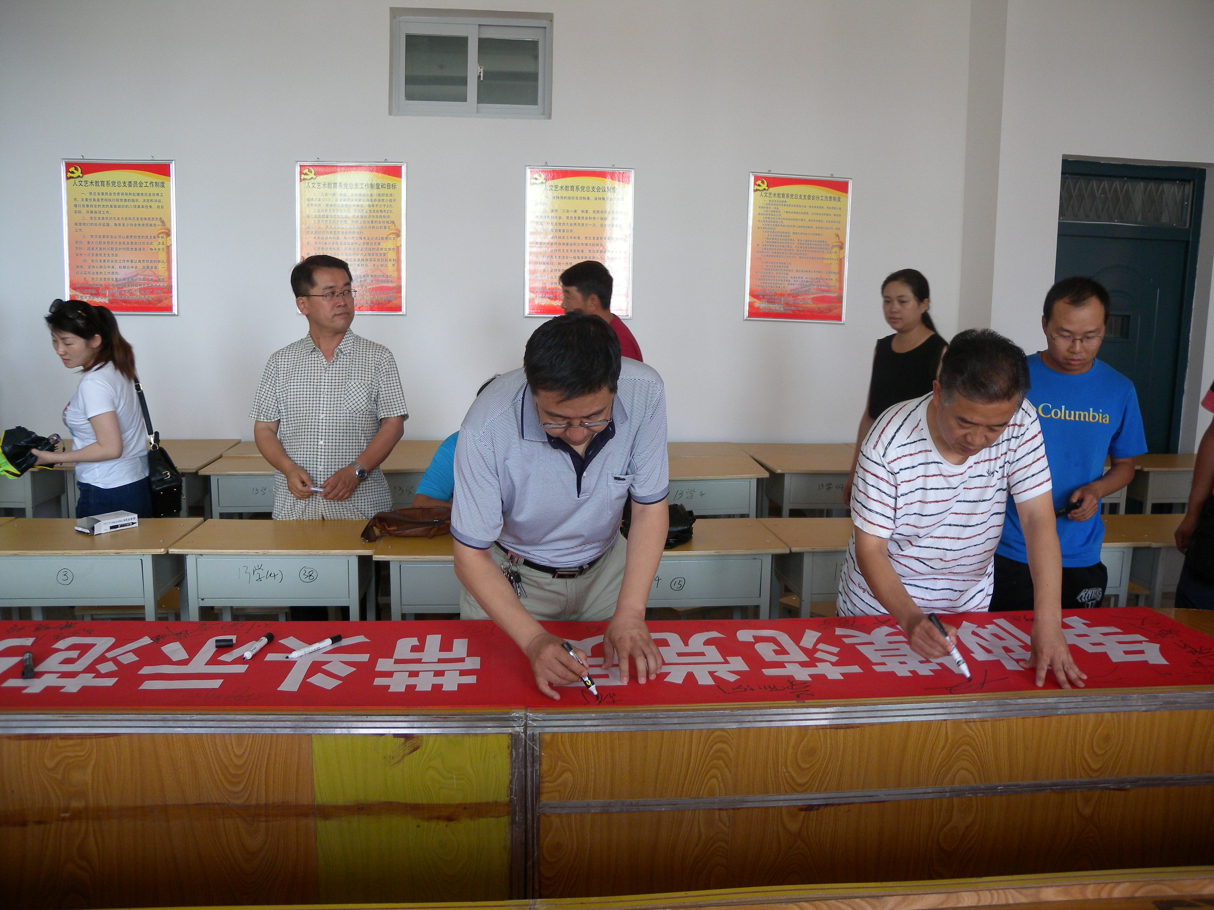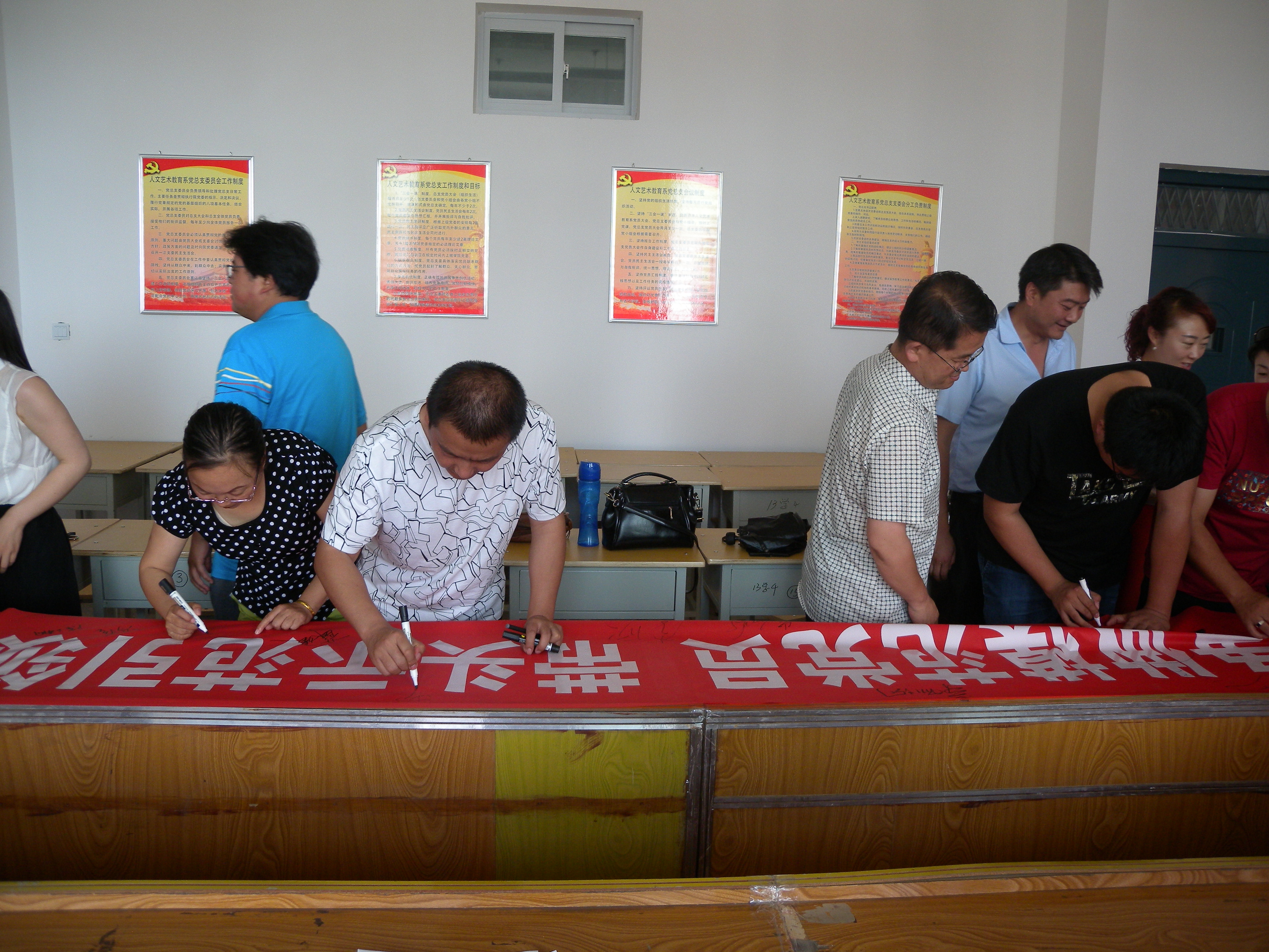 根據(jù)學(xué)院黨委慶“七一”系列活動(dòng)方案,人文藝術(shù)教育系黨總支于7月4日下午在勵(lì)勤樓403黨員活動(dòng)室開(kāi)展了“爭(zhēng)做模范黨員,帶頭示范引領(lǐng)” 師生黨員簽名活動(dòng)。