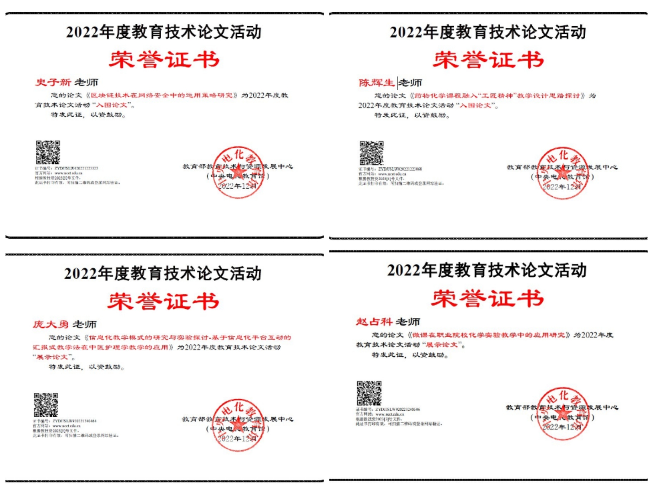 近日,教育部教育技術(shù)與資源發(fā)展中心(中央電化教育館)2022年全國師生信息素養(yǎng)提升實(shí)踐活動(dòng)(第二十六屆教師活動(dòng))評(píng)審結(jié)果出爐。學(xué)校趙占科、龐大勇、史子新、陳輝生四名教師的教育技術(shù)論文被分別評(píng)為展示論文和入圍論文,學(xué)校在2022年度教育技術(shù)論文活動(dòng)組織工作中被評(píng)為突出貢獻(xiàn)學(xué)校。