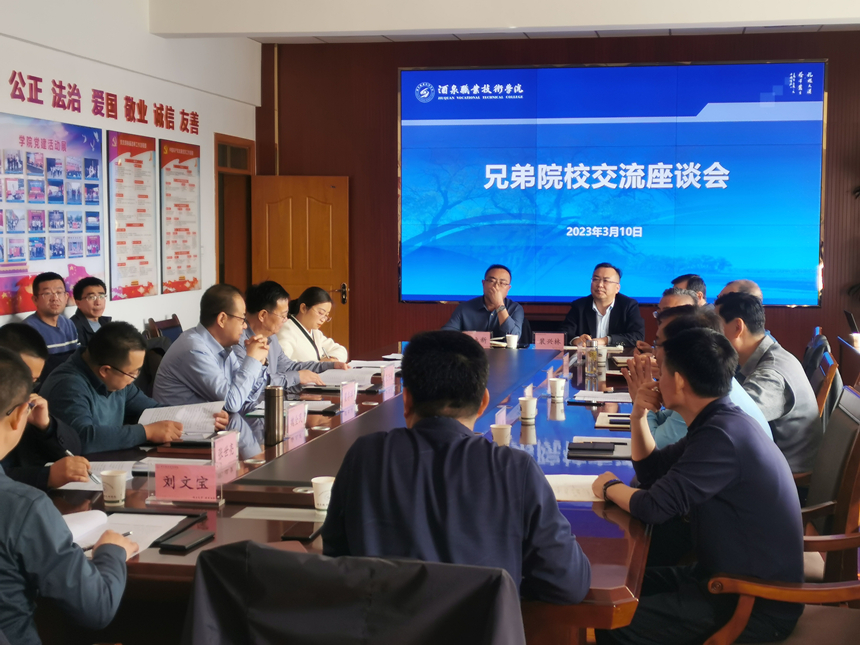 在行知樓會議室召開交流座談會。座談會上,許軍詳細(xì)介紹了酒泉職業(yè)技術(shù)學(xué)院發(fā)展的辦學(xué)特色、專業(yè)建設(shè)、“雙高計劃”項目建設(shè)和申辦本科層次職業(yè)技術(shù)大學(xué)等情況。翟存祥介紹了武威職業(yè)學(xué)院“雙高計劃”項目建設(shè)和申辦職業(yè)技術(shù)大學(xué)進(jìn)展。雙方就“雙高計劃”項目建設(shè)中遇到的堵點、痛點、難點問題和本科層次職業(yè)學(xué)校申辦、高水平專業(yè)群打造、“三教”改革、科研平臺搭建、社會服務(wù)能力提升、產(chǎn)業(yè)學(xué)院體制與管理、國際合作交流等工作進(jìn)行了深入探討交流。