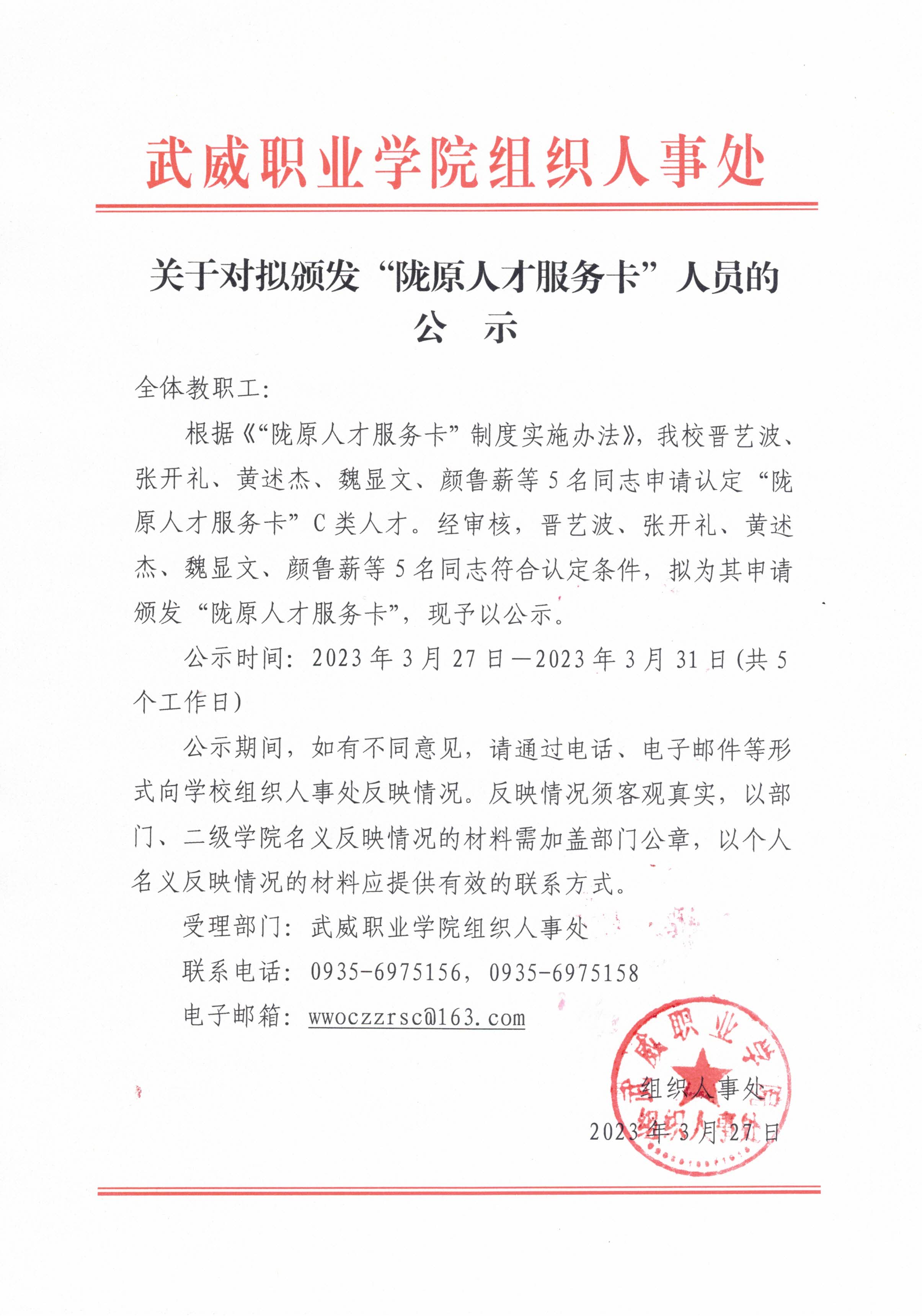 關(guān)于對擬頒發(fā)“隴原人才服務(wù)卡”人員的公示