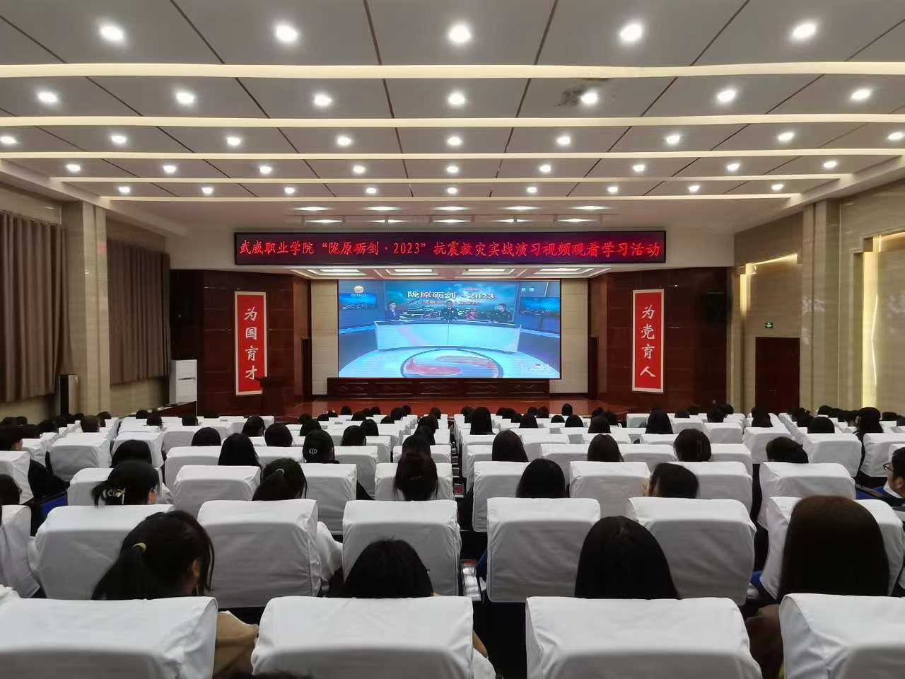 為進(jìn)一步擴(kuò)大演習(xí)影響,提升各級(jí)各方面抗震救災(zāi)能力水平和全社會(huì)防震減災(zāi)意識(shí),5月6日上午,安全保衛(wèi)處組織后勤管理處、各二級(jí)學(xué)院、食堂、公寓等相關(guān)人員參加“隴原礪劍·2023”抗震救災(zāi)實(shí)戰(zhàn)演習(xí)視頻觀摩和直播觀看活動(dòng)。