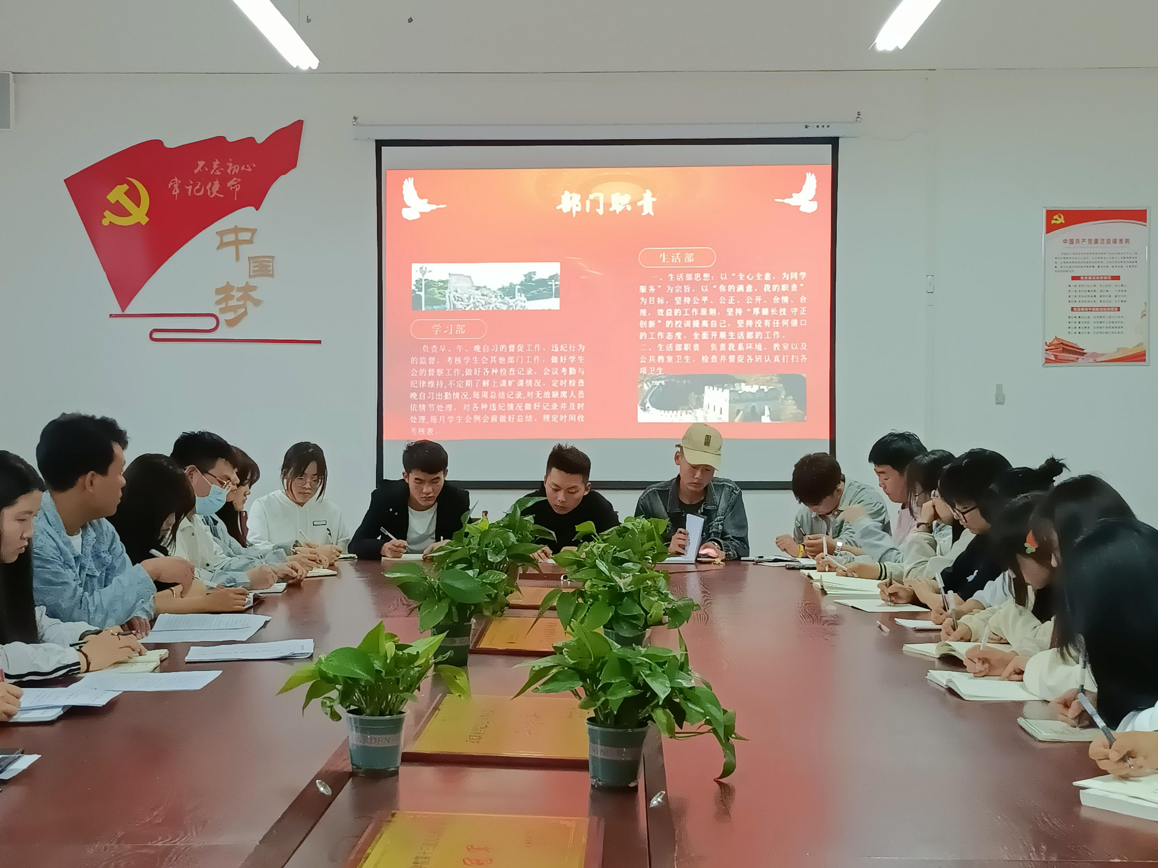 ? ? ? ? ??? ? ? ?會議第二項(xiàng)由胡瑞琪講述學(xué)生例會制度,為了更好的服務(wù)同學(xué),每次例會都會實(shí)行考勤制度,由各部長向主席團(tuán)匯報(bào)本周的工作情況,再由主席團(tuán)向輔導(dǎo)員匯報(bào)本周問題,并安排下周工作。接著我院主席團(tuán)成員尚寶萍表達(dá)了對團(tuán)學(xué)工作的充分肯定和支持,同時(shí)也提出了幾點(diǎn)工作的不足。各部門部長也更加詳細(xì)的對工作內(nèi)容進(jìn)行了的介紹。??