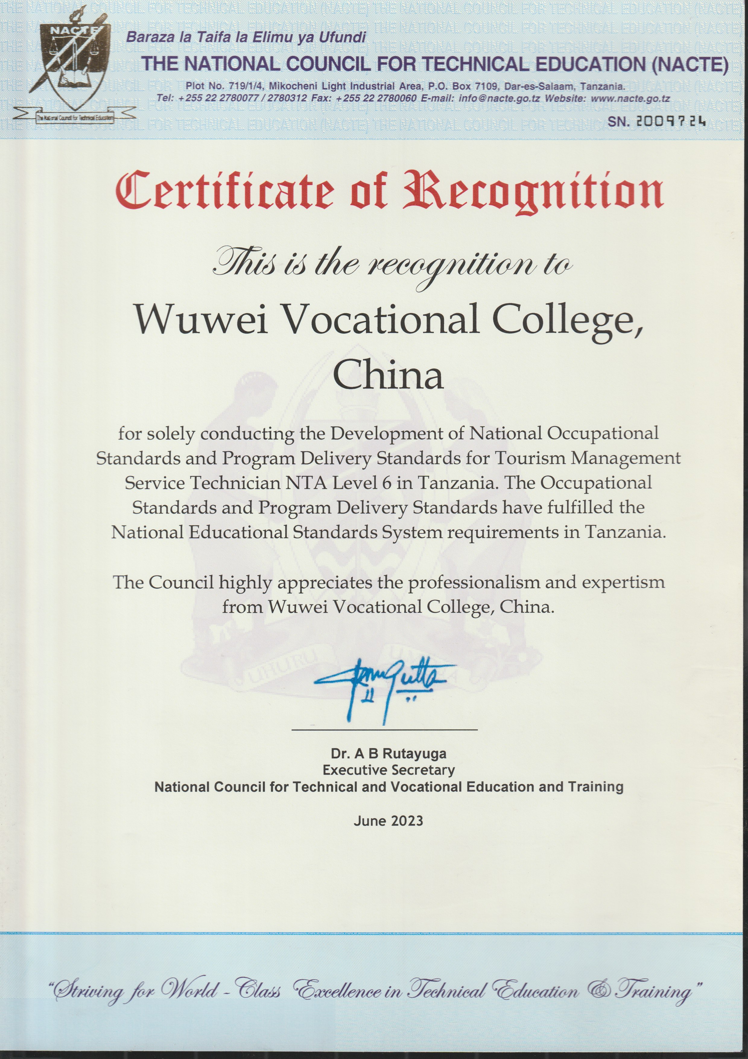 學(xué)校獨(dú)立開(kāi)發(fā)制定的職業(yè)標(biāo)準(zhǔn)和配套專(zhuān)業(yè)教學(xué)標(biāo)準(zhǔn)正式納入坦桑尼亞國(guó)家職業(yè)教育體系